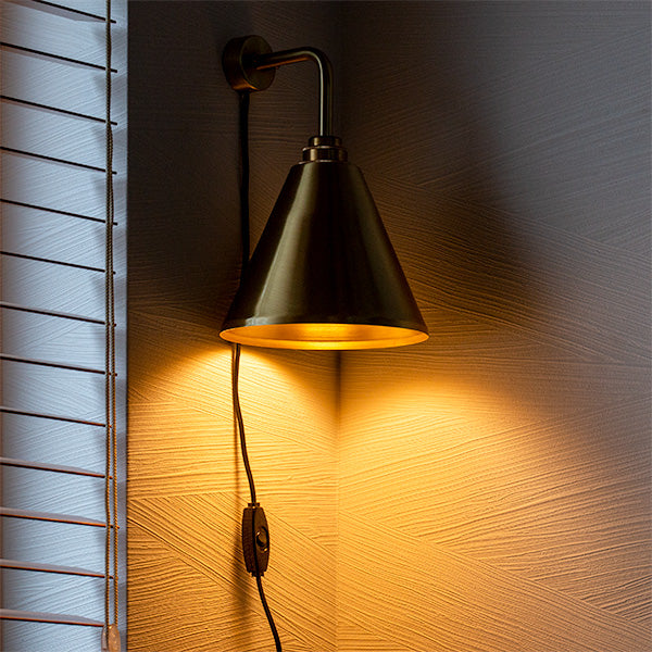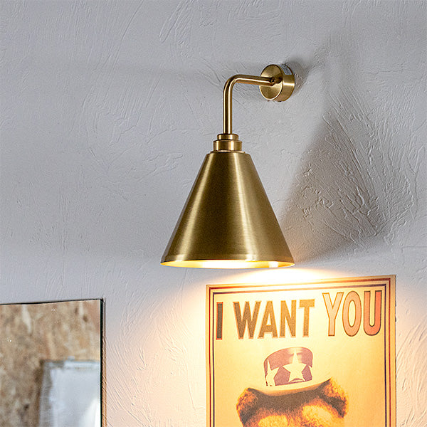 真鍮にこだわったシンプルなウォールライト。高さの異なるSサイズとLサイズの2タイプをご用意しました。 電源はコンセントまたは壁から直接とどちらにも対応しています。コンセントの場合は工事不要で設置も簡単。※電球は別売りです。