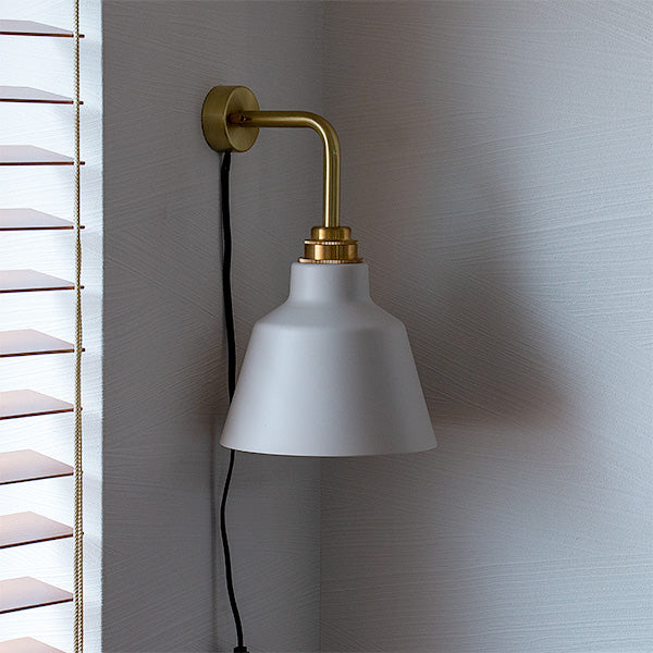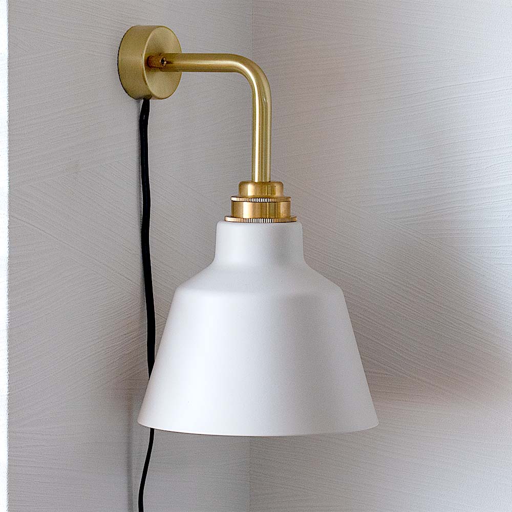 真鍮とスチールシェードの組み合わせがおしゃれなシンプルなウォールライト。シェードカラーはブラックとホワイトの2色をご用意しました。真鍮のゴールドと相性のいいカラーリングです。 電源はコンセントまたは壁から直接とどちらにも対応しています。コンセントの場合は工事不要で設置も簡単。※電球は別売りです。