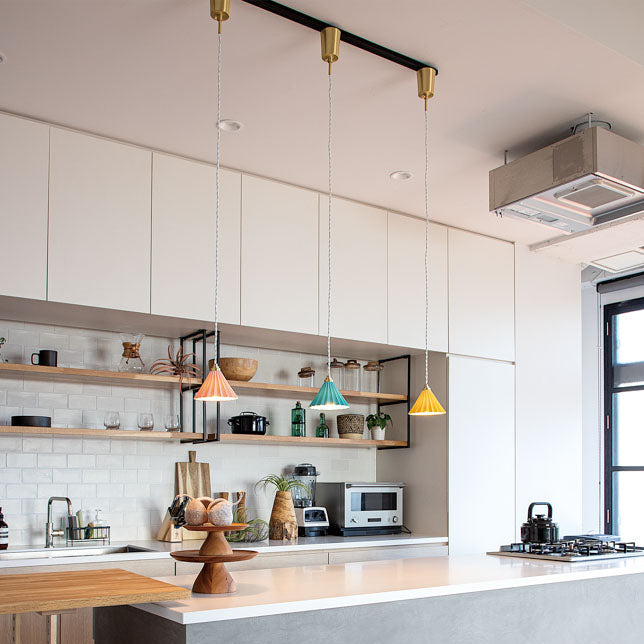美濃焼が灯す、透け感あるぬくもり。 ORIGAMIドリッパーを使用したランプシェード「dripper lamp」。まるで折り紙を折ったような美しいフォルムが人気のORIGAMIドリッパー。岐阜県美濃地方で熟練の職人たちが一つ一つ手仕事で作り上げる磁器のドリッパーは世界中のバリスタから愛用される名作として高く評価されています。そんなORIGAMIドリッパーの色合い・サイズ感などがあまりにもランプシェードにぴったりであった事から“そのまま”ランプに。真鍮のパーツを組み合わせて上品に仕上げました。薄いつくりのドリッパーは点灯すると光がうっすらと透過。ぬくもりと透け感が磁器ならではの美しさを演出します。