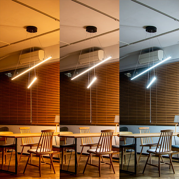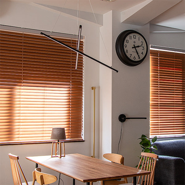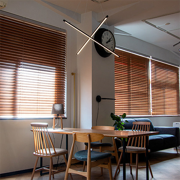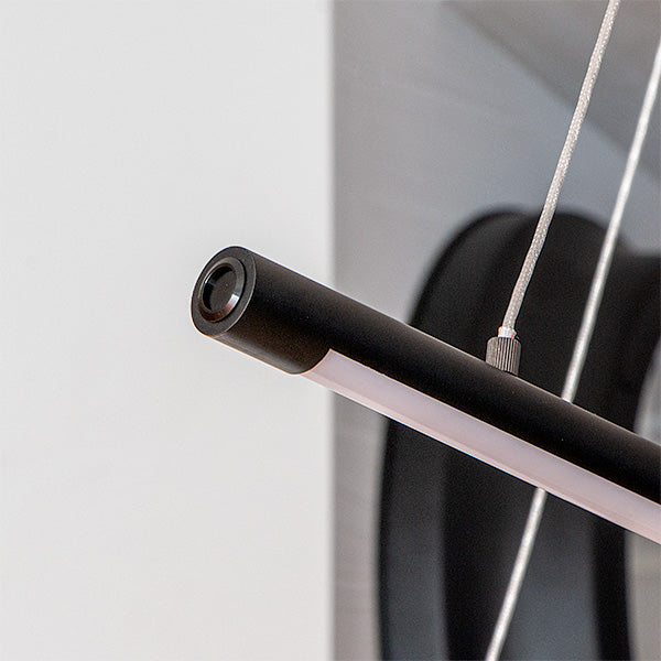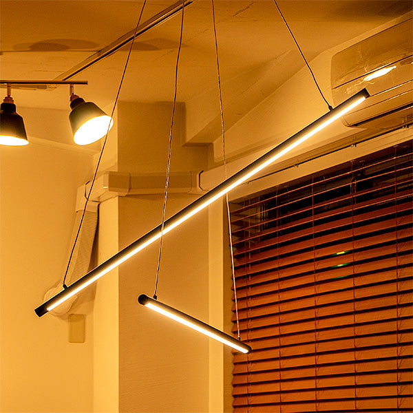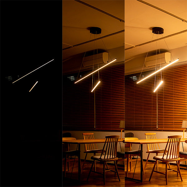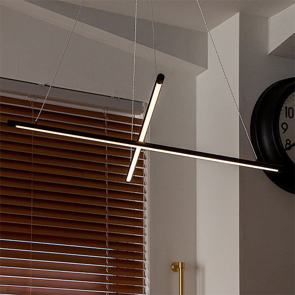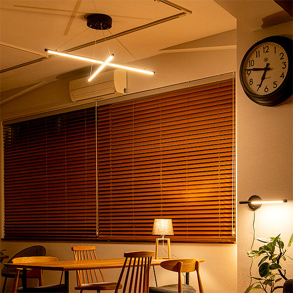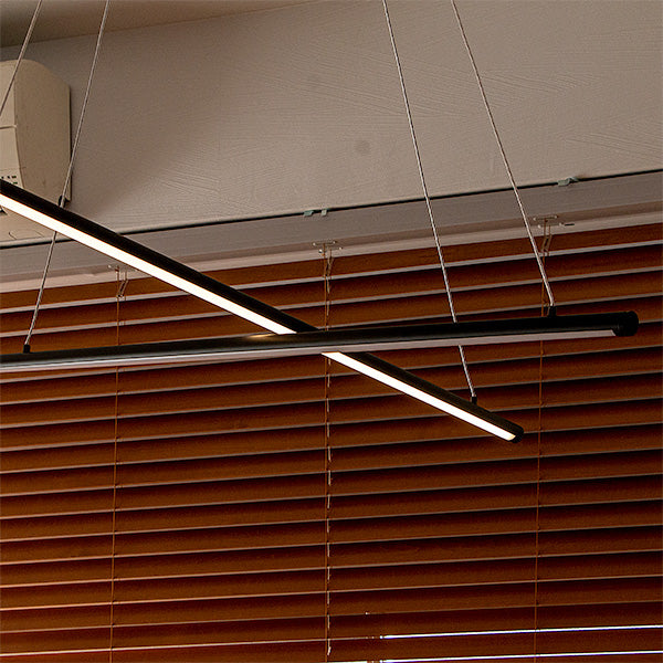 他にはないユニークなスタイル。しかもスマートスピーカー対応。 2本の黒いLEDバーライトをワイヤーコードで交差するように吊るしたLEDペンダントライト、名前は「マンクスクロス」。単純なデザインですが、他では見かけない個性的なスタイル。シンプルでスタイリッシュなデザインなのでモノトーンインテリアやモダンインテリアなどにおすすめ。 天井から吊るすだけで空間にインパクトを与えてくれるペンダントライトです。 バーライトはワイヤーコードで吊られているため遠くから見ると、バーライトが浮いているようなデザイン。ワイヤーの長さを調節することでバーの高さを調節できます。水平にしたり、傾けたりとアレンジ可能です。 明るさは最大2,600ルーメン。4.5~6畳前後ならしっかり照らせるほどの明るさ。 リモコンで点灯・消灯はもちろんのこと、明るさ調節や色味調節といった機能に加え、チャンネルが6つあり、お好みに合ったグループ分けに対応。更にリラックス、リード、ナイト、エコといったモードボタン、お客様がお好みに合わせて明るさや色味を設定できるメモリーボタン、また、ON/OFFタイマーなどを搭載しました。 スマホアプリ「スマートライフ」に対応。スマホアプリを使うメリットは主に次の3つ ●スケジュール設定で照明器具の点灯、消灯を自動化 ●外出先から照明器具をコントロール ●照明器具をスマートスピーカーでコントロール スマートスピーカーで「間接照明つけて」はありですし、設定によっては、家に近づくとON、家から離れるとOFF、タイマー設定で就寝中にOFFみたいな使いかたができます。