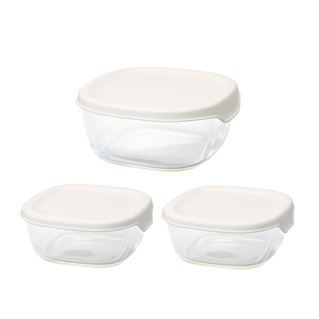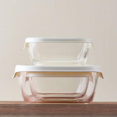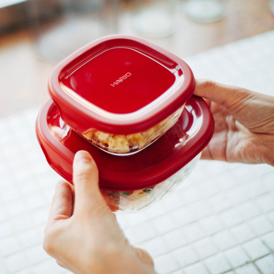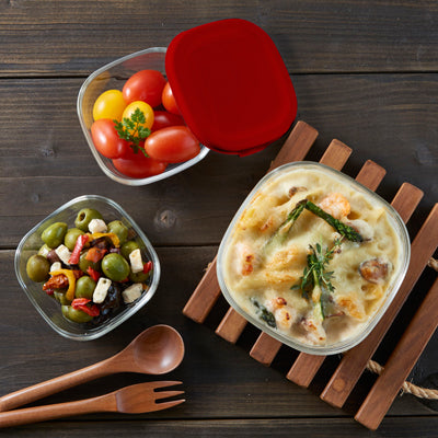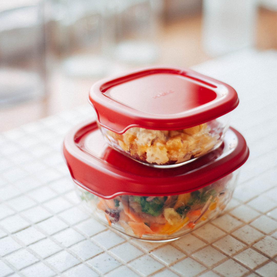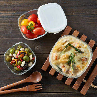 オーブン調理もできる耐熱ガラスの角型保存容器食洗機・熱湯・電子レンジ・オーブンOK。入れ子収納OK。調理してそのまま食器として使えます。