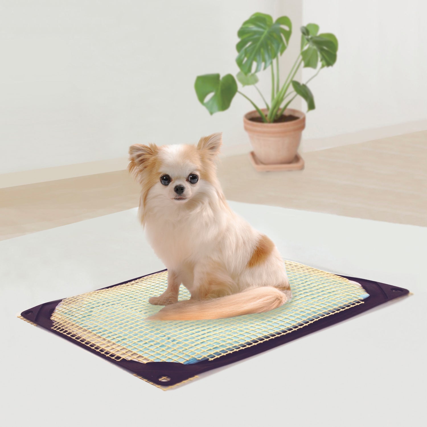 こちらの商品はワンコトイレマットレギュラーのメッシュです。ペットシーツの噛みちぎりや引っかきなどのイタズラ防止に。挟むだけのワンタッチで取り付け簡単。