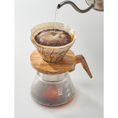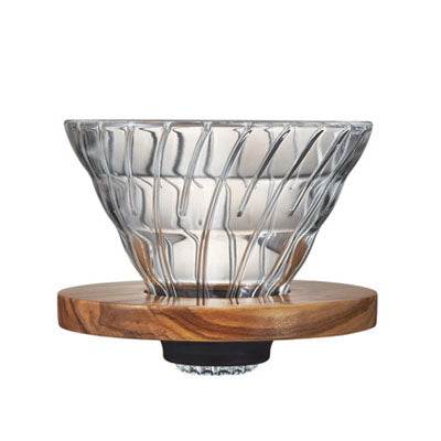 V60耐熱ガラス透過ドリッパーにオリーブウッドホルダーを組み合わせたドリッパー。ナチュラルな雰囲気をお愉しみください。1〜4杯用。