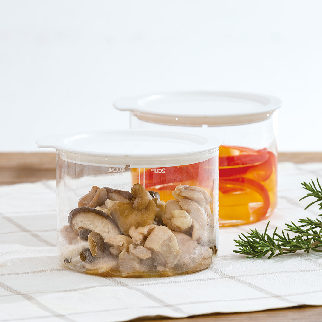 ビネガーズシリーズでお家でカフェ気分。 メイン料理から副菜まで簡単に調理できるフードコンテナの400mLサイズ。耐熱ガラス製なので電子レンジで時短調理が可能。ビネガーで漬け込んで作るヘルシー料理レシピ付き。