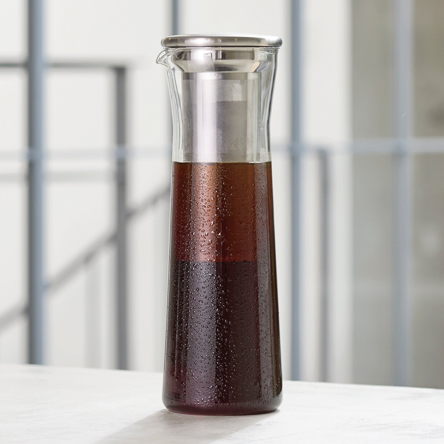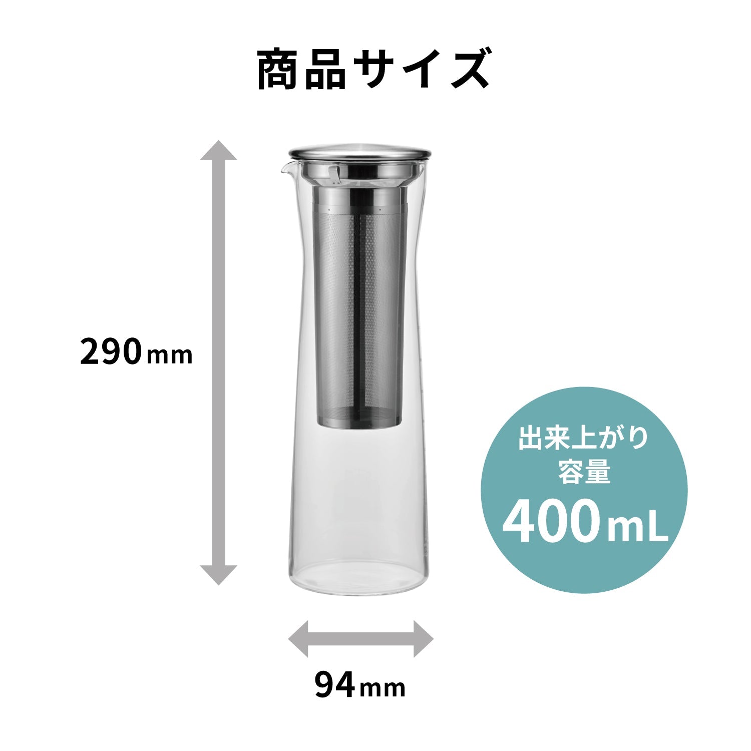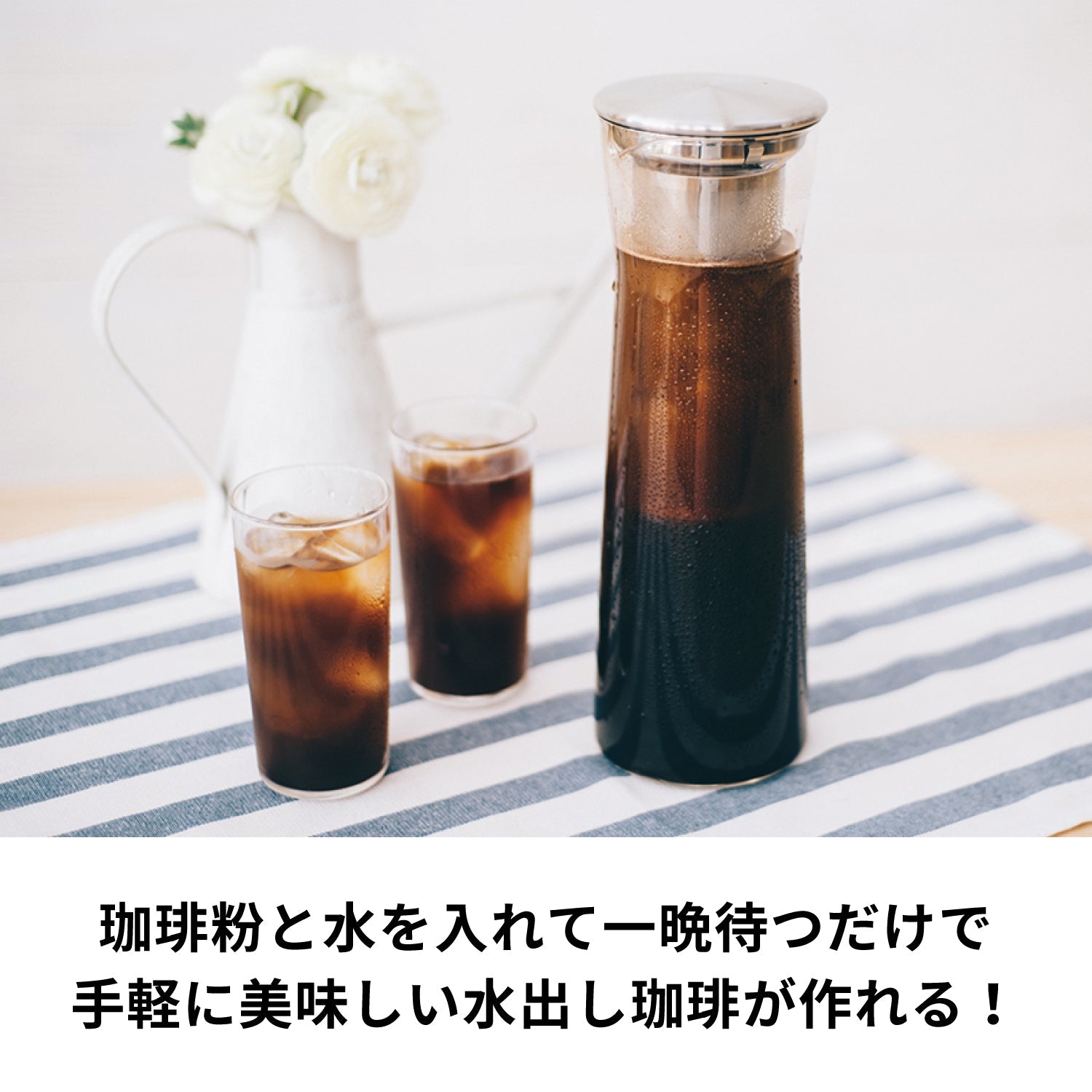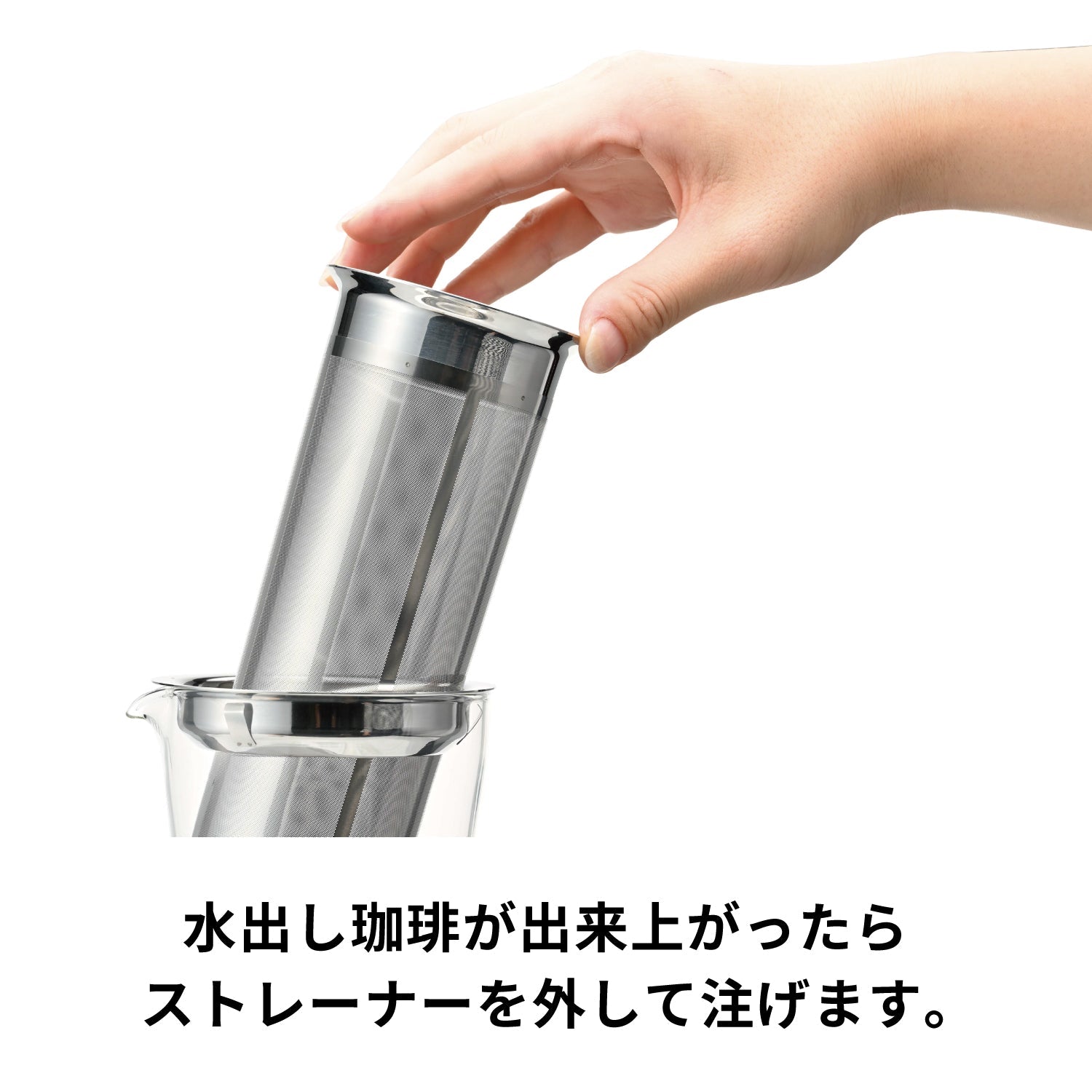 コーヒー粉と水だけでアイスコーヒーが抽出できます。ストレーナーにコーヒー粉を入れ、注ぎ口にセットしたら少量ずつ水を注ぎます。水を注ぎ終えたらフタをします。冷蔵庫で8時間ほど抽出してできあがりです。水出しコーヒーの味わいをお楽しみください。※ストレーナーを外してもフタが外れにくいホルダーが付きました。出来上がり容量:1,000mL