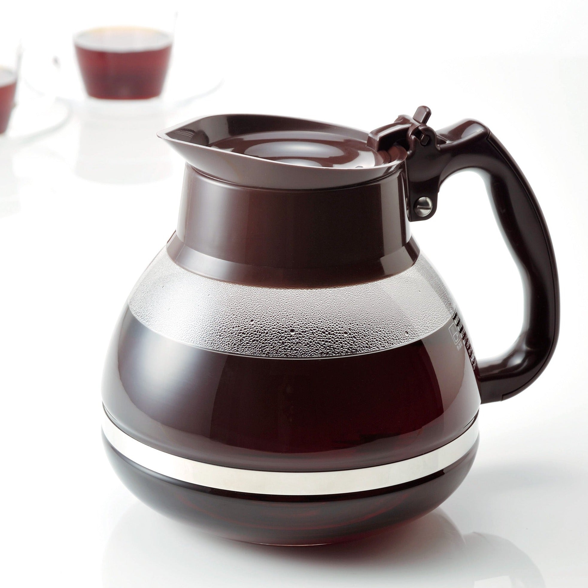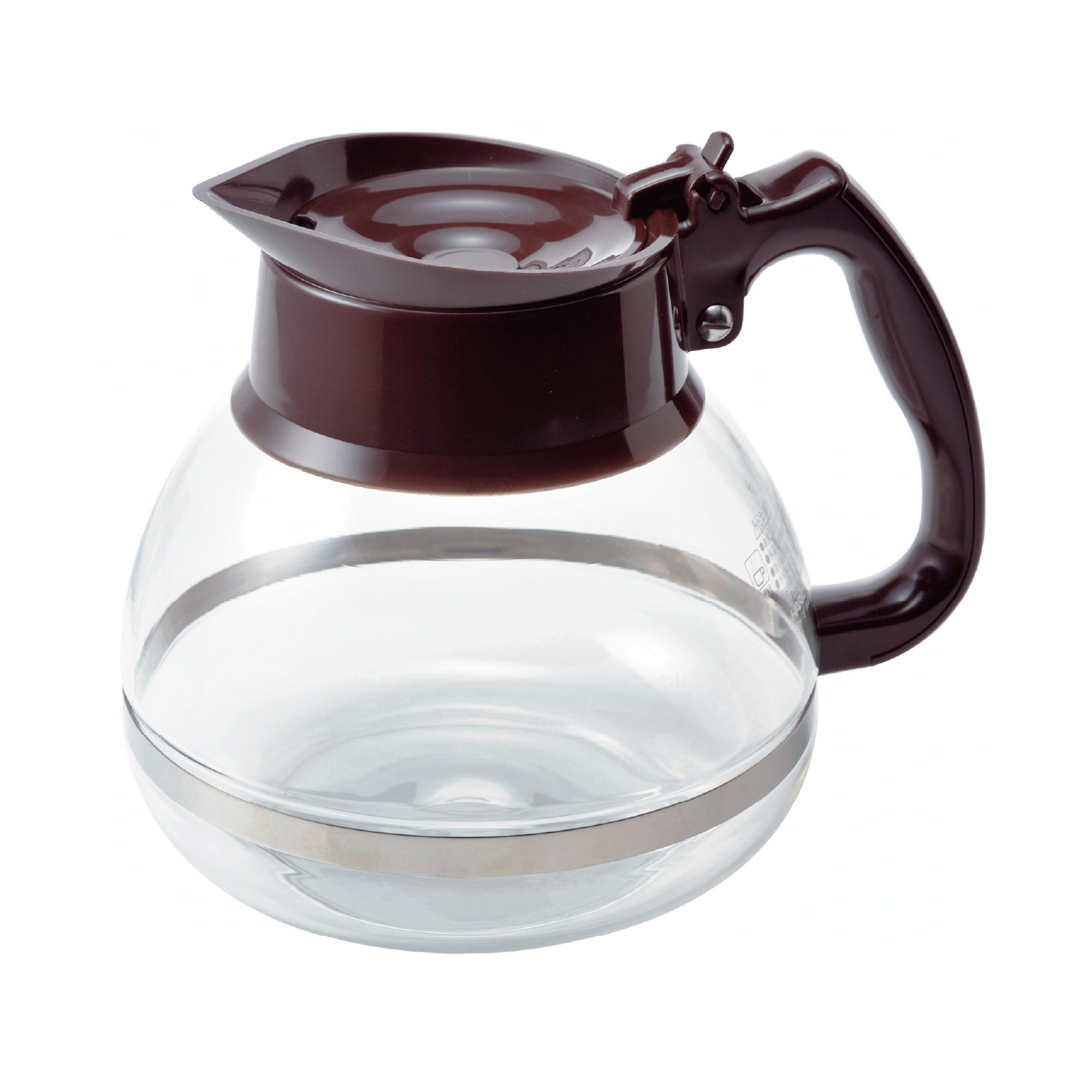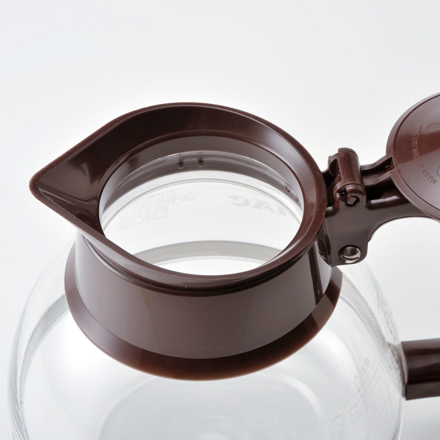 業務用マシン対応安心設計のデカンタ。注ぎやすく水切れの良い樹脂性の注ぎ口です。フタの開閉はらくらくワンプッシュ式。ハンドルは2バンド構造の安心設計です。耐熱ガラス製なので熱湯洗浄が可能で衛生的に使用できます。