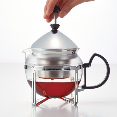 お好みの濃さで茶葉を引き上げられ、フタの内側に収まる茶こし。2杯目もおいしくいただけます。