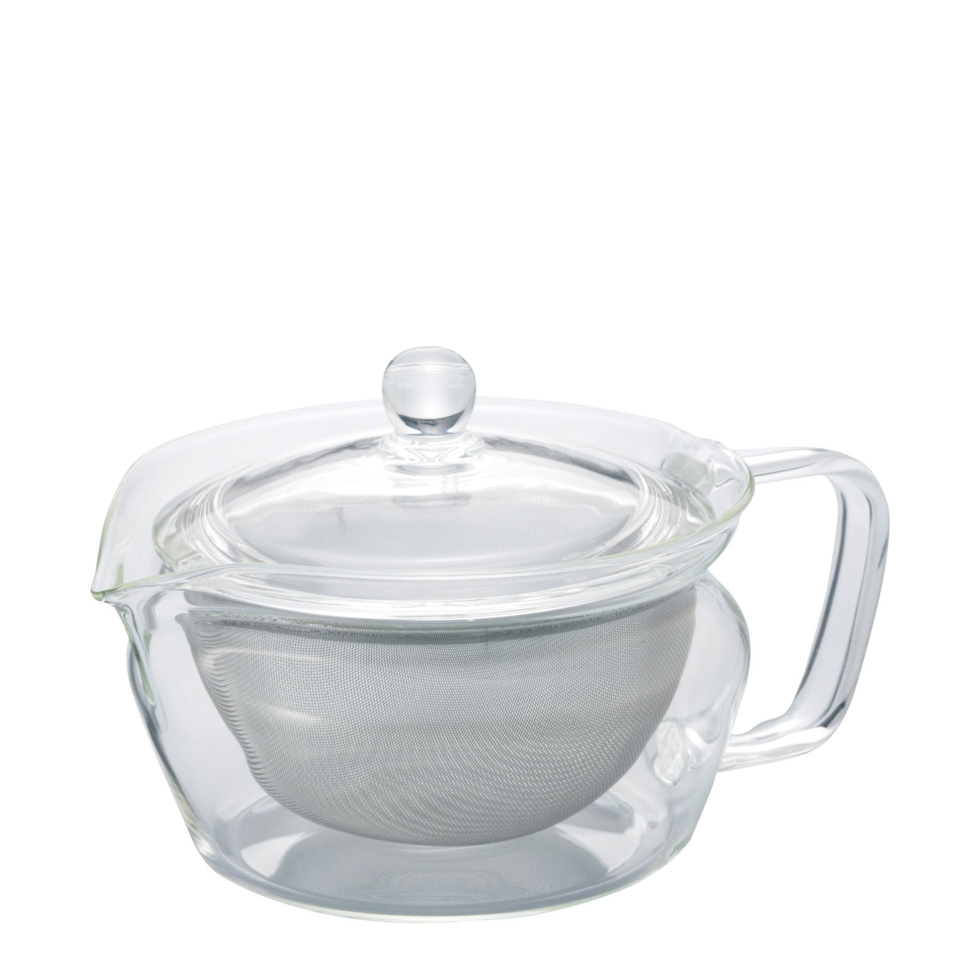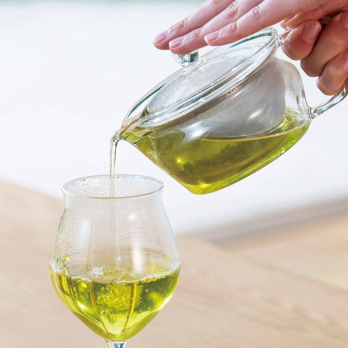 日本茶をスタイリッシュに愉しむ、耐熱ガラス製の急須。美味しいお茶を淹れるために、ガラスの形状に沿う大きな茶こしで茶葉の旨味をしっかり抽出します。注ぎやすさを追求し最後の一滴までスムーズに注げる形状です。注口は注ぎやすいテーバー形状。