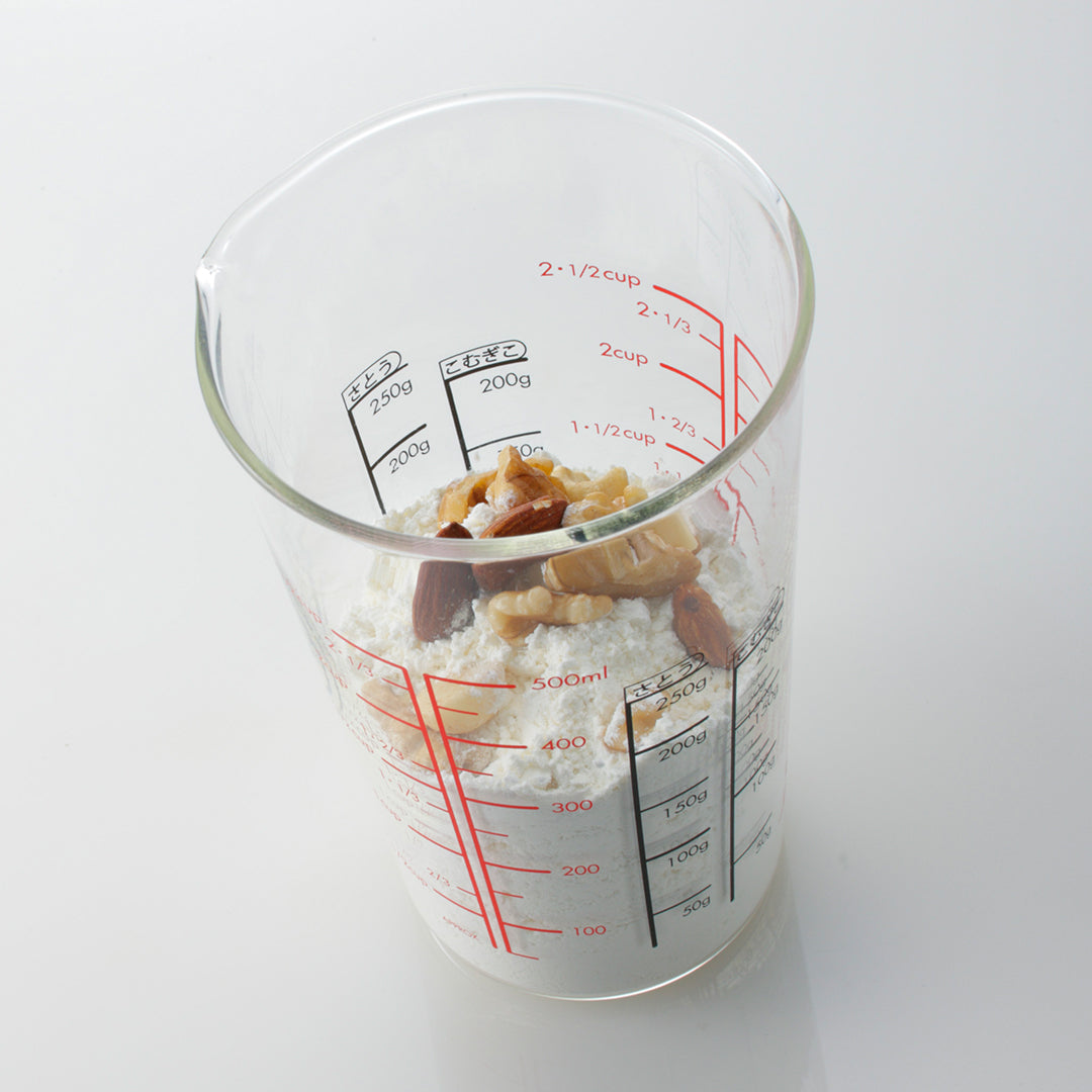 中からも読めるメモリ。粉ものは黒、液体は赤の計量メモリで読みやすい。