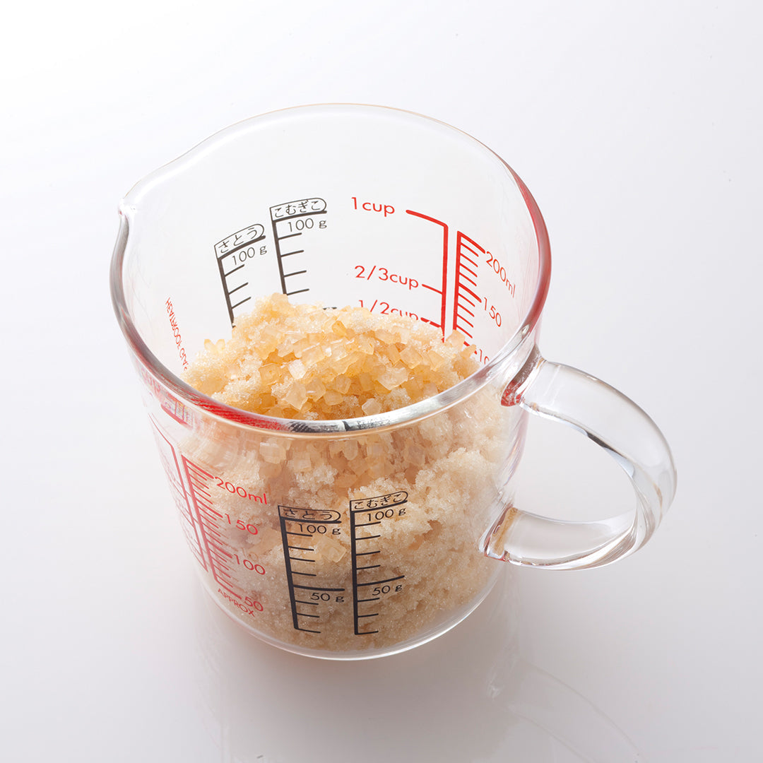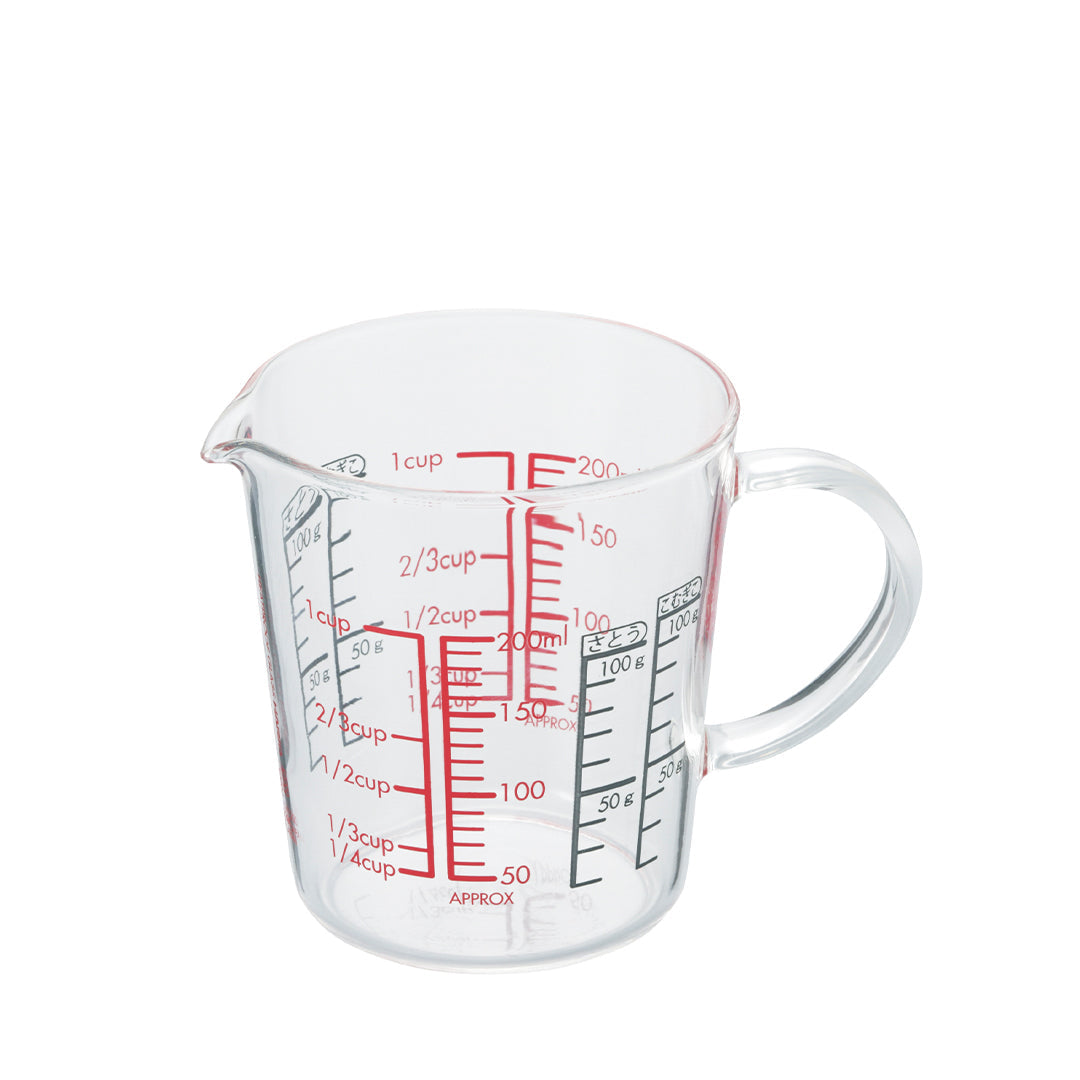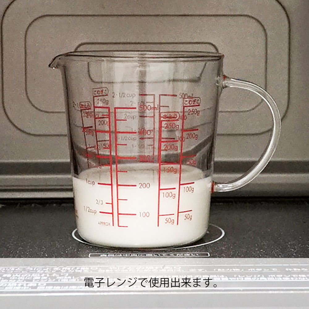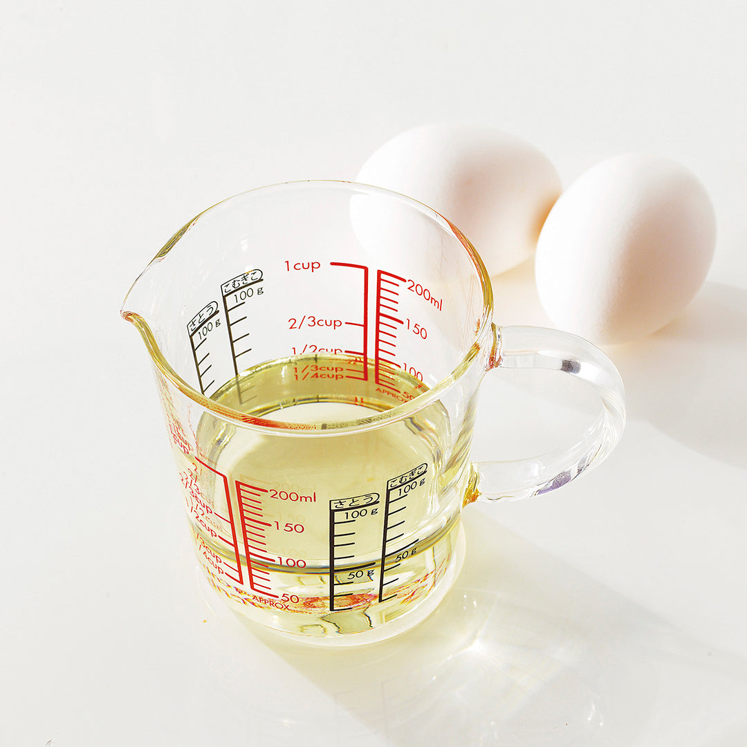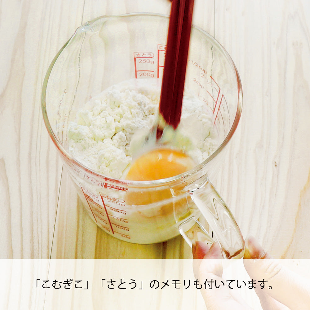 肉厚のガラスで安心。中から見えるメモリで使いやすく、計量するものによって見やすい色でプリントしています。持ちやすい取っ手付き。電子レンジ・食器洗い乾燥機OK。