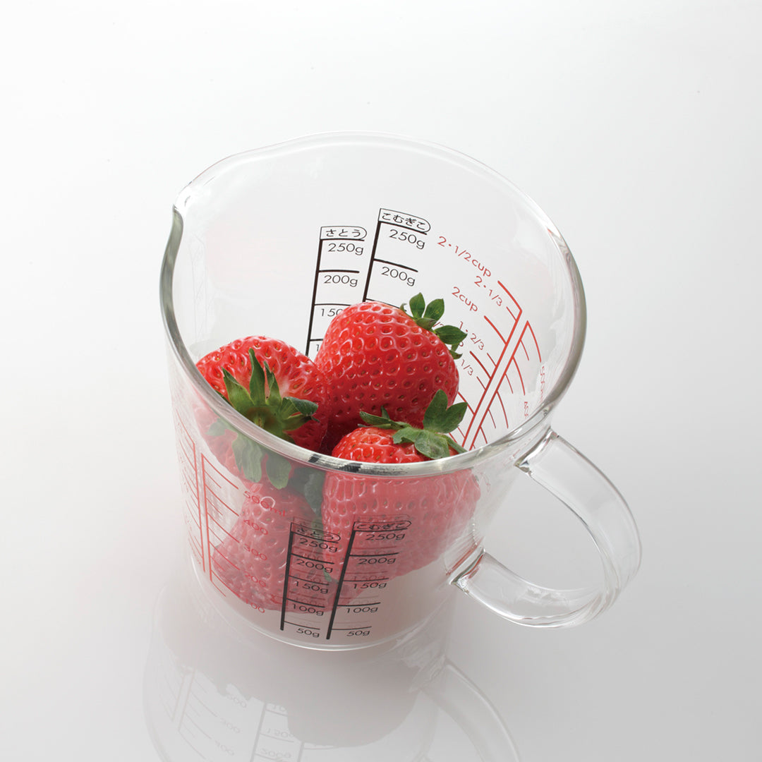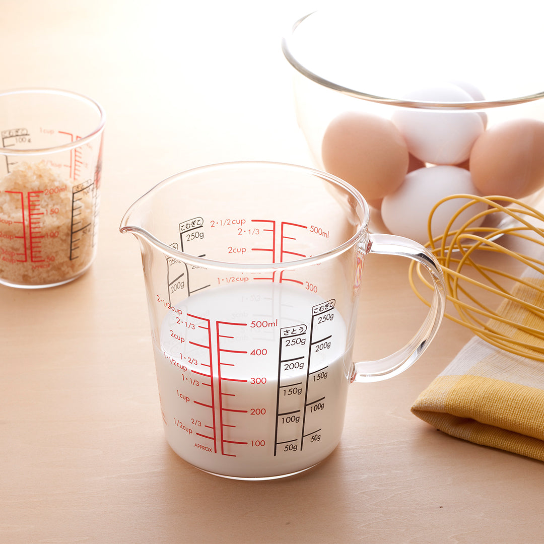 中からも読めるメモリ。粉ものは黒、液体は赤の計量メモリで読みやすい。取っ手つきです。