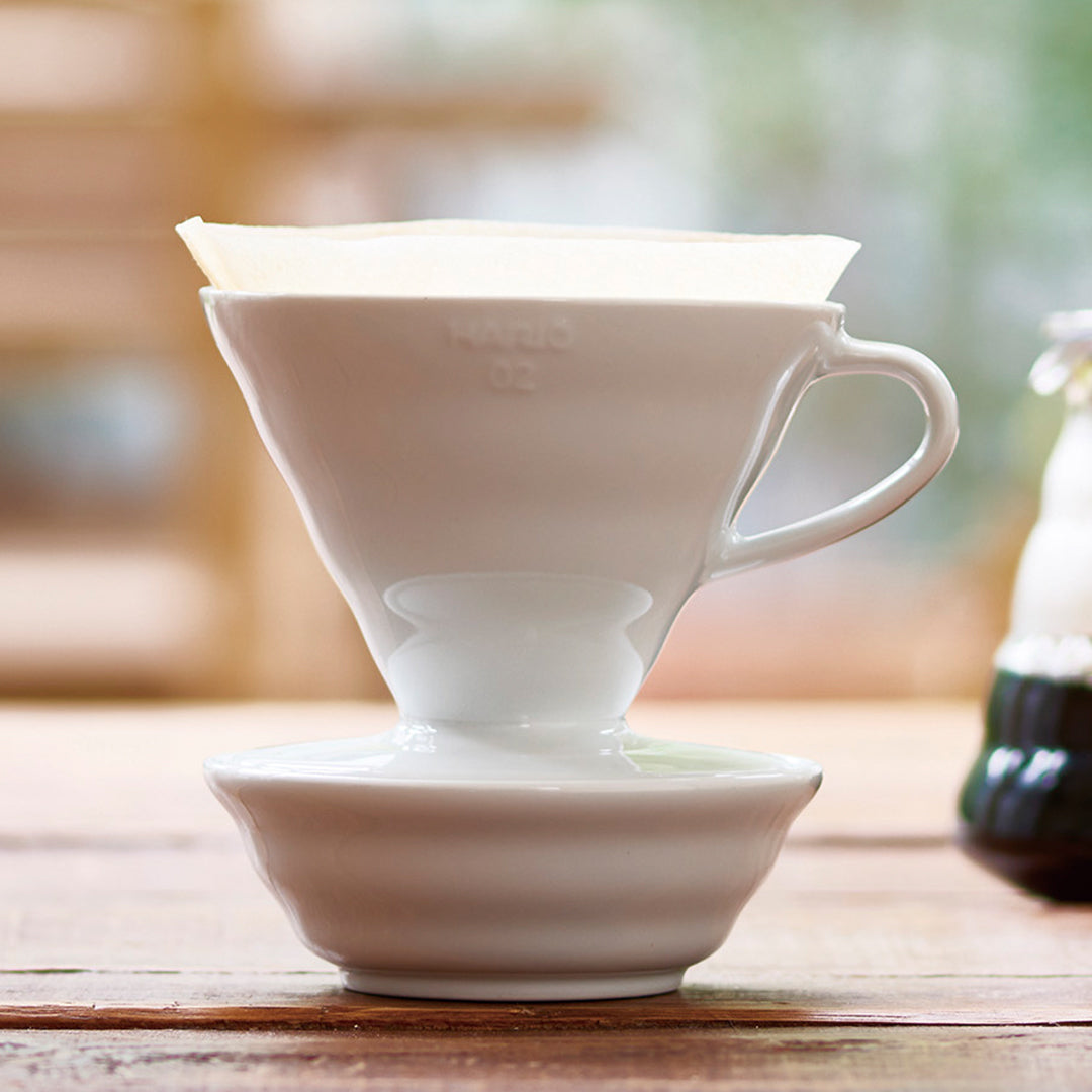 コーヒー抽出後のドリッパーをのせるドリップトレイが新登場。磁器製のドリップトレイはV60ドリッパー01サイズ・02サイズがのせられます。コーヒー抽出後のドリッパーをスムーズにサーバーから移動することができます。使用済みのティーバッグ置きとしても使用できます。