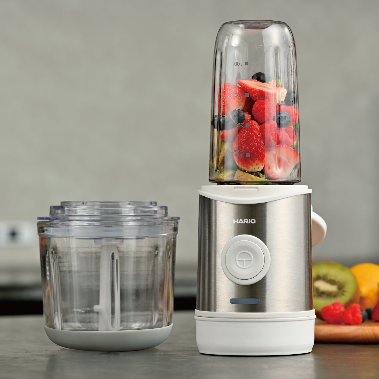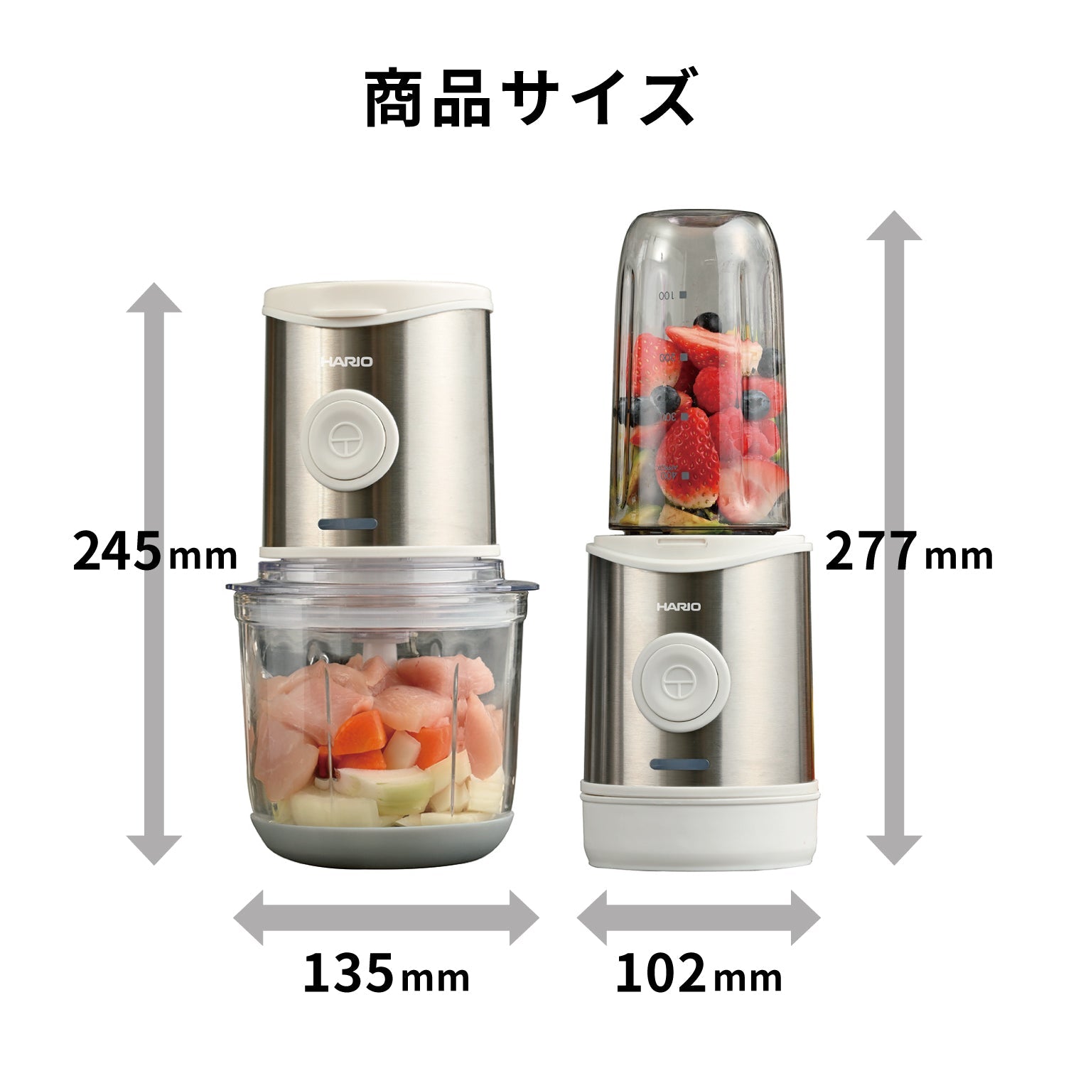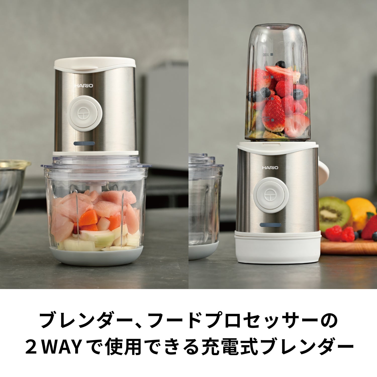 ブレンダー、フードプロセッサーの2WAYで使用できる充電式ブレンダー。部品を付け替えて、スムージーやジュースを作ることができるブレンダーとして使用したり、調理の下ごしらえができるフードプロセッサーとしても使用できます。USB充電なのでコードレスでご使用いただけます。