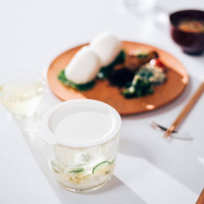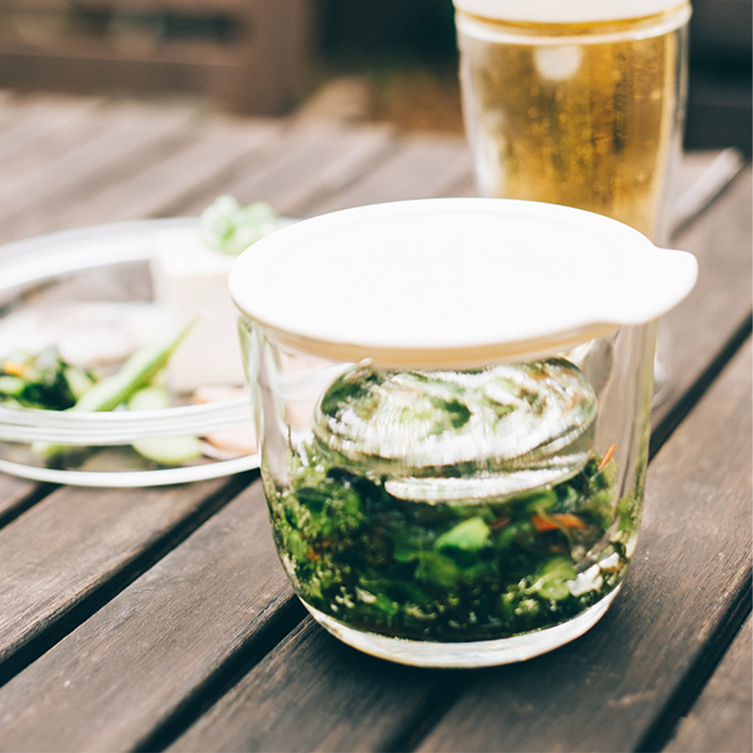 本体は耐熱ガラスなので、電子レンジ加熱OK。根菜類など漬かりにくい野菜も少しの電子レンジ加熱で、すばやく調理できます。保存容器のフタは、パッキン付きで臭い漏れしにくい。コンパクトサイズなので冷蔵庫の中もすっきり保存できます。
