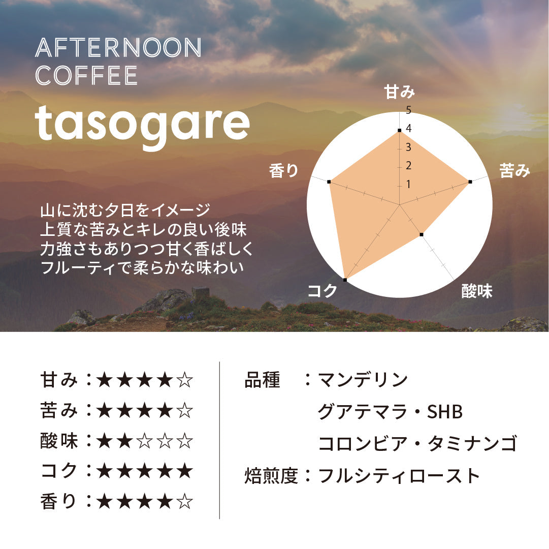 シングルオリジンだけを贅沢にブレンドした高級豆×高級豆のスーパーブレンド 「モーニングコーヒー MEZAME」と「アフタヌーンコーヒー TASOGARE」のセットを送料無料でお届け致します。「モーニングコーヒー MEZAME」内容量:約180g(豆のままの状態です)品種:ケニアAA/マラウィ・ミスク/コロンビア・タミナンゴ焙煎度:フルシティロースト 「アフタヌーンコーヒー TASOGARE」内容量:約180g(豆のままの状態です)
