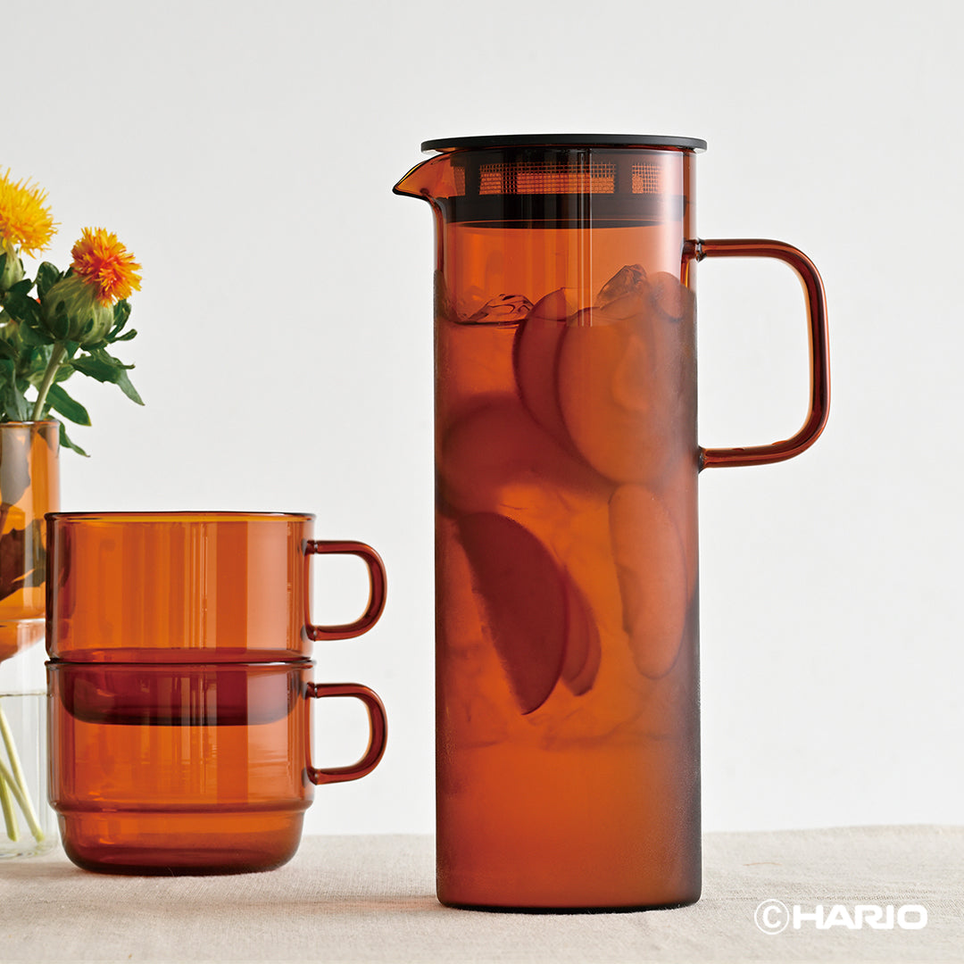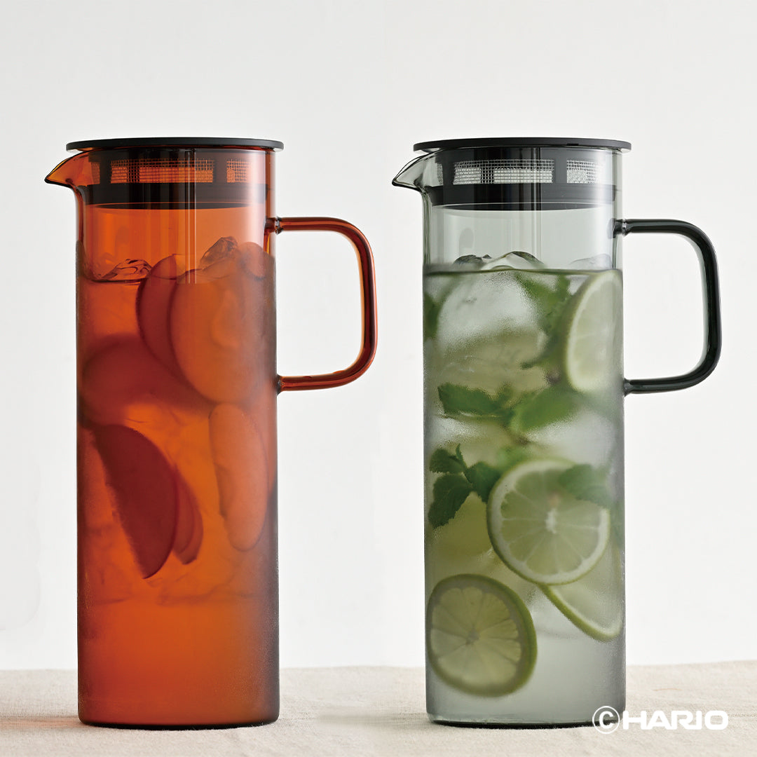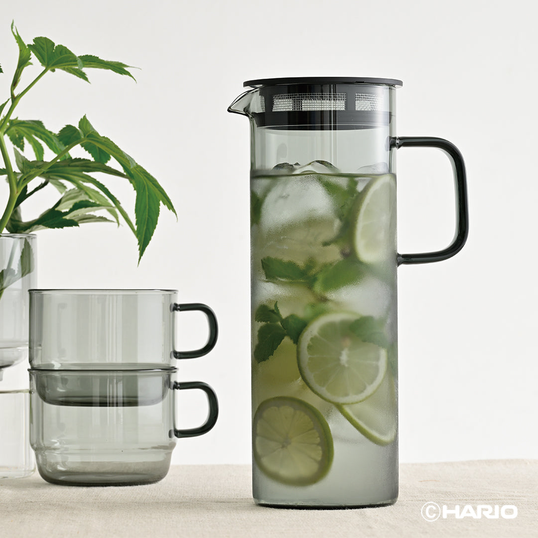 耐熱ガラス製のカラーガラスシリーズ「HARIO COLORS」。グレーとアンバーの2 色展開で、テーブルトップに彩りを添えます。メッシュフィルター付きのフタがついたガラスピッチャー。注ぎ口のフィルターが中身を濾してくれるので、茶葉やフルーツを入れてそのまま注ぐことができます。水出し茶やフルーツウォーターをお愉しみいただけます。