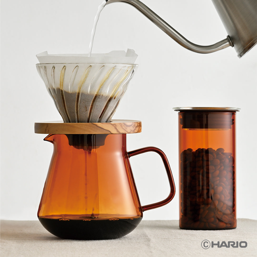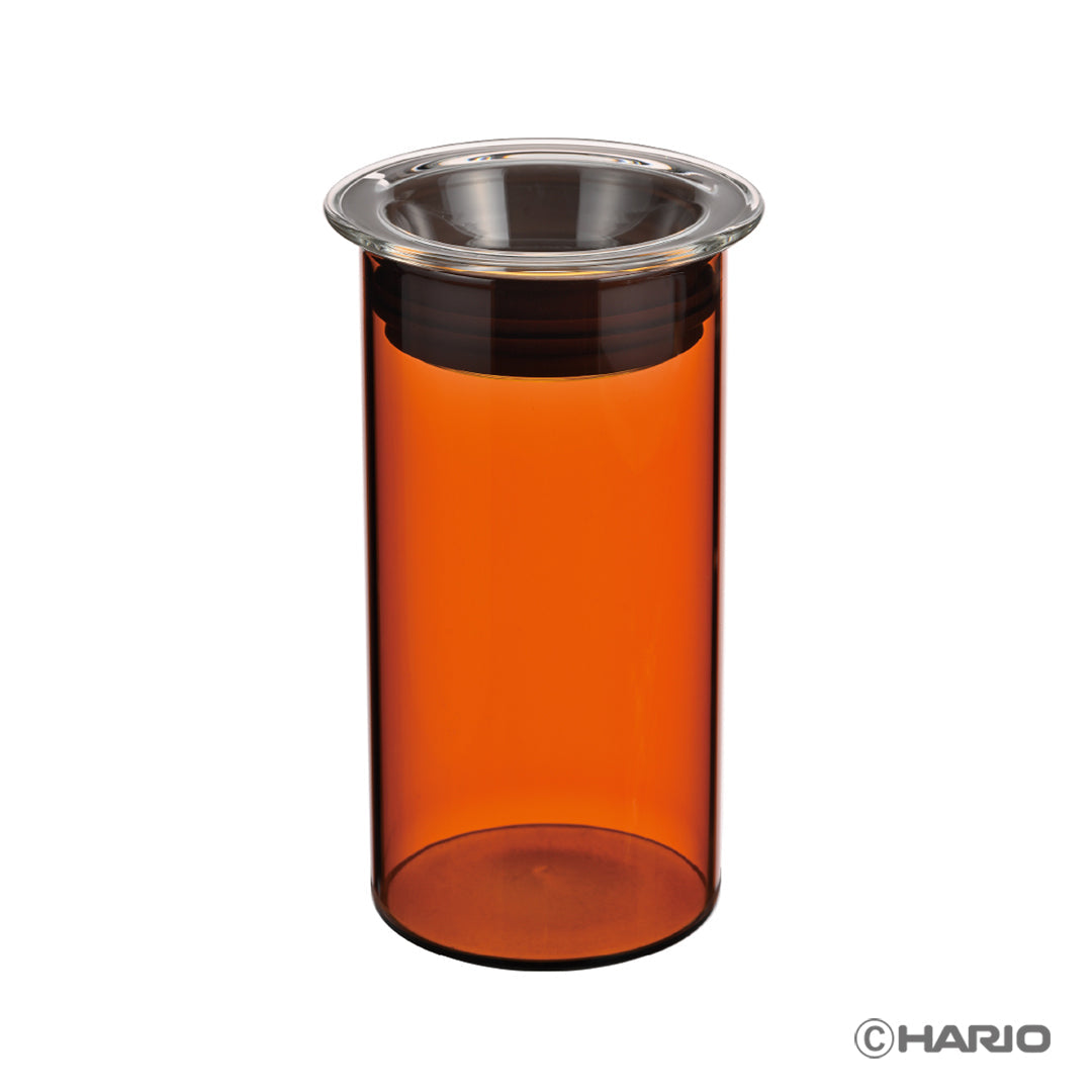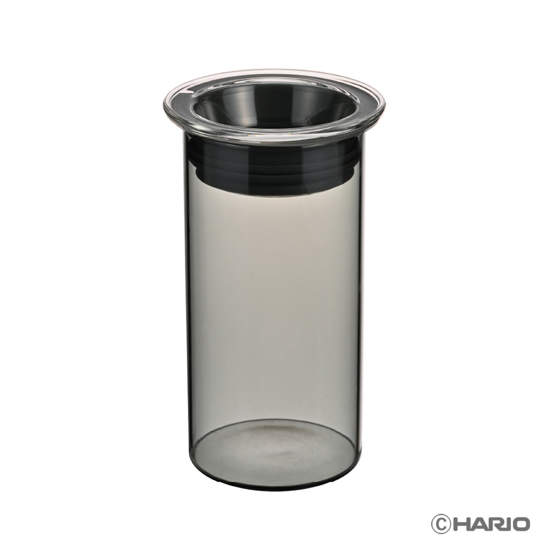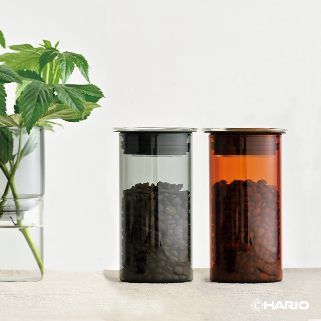 耐熱ガラス製のカラーガラスシリーズ「HARIO COLORS」。グレーとアンバーの2 色展開で、テーブルトップに彩りを添えます。シリコーンパッキン付きのフタでしっかり密閉できるカラーガラスのキャニスター。フタは透明ガラスなので中の状態を見ることができます。コーヒー豆が100g入ります。