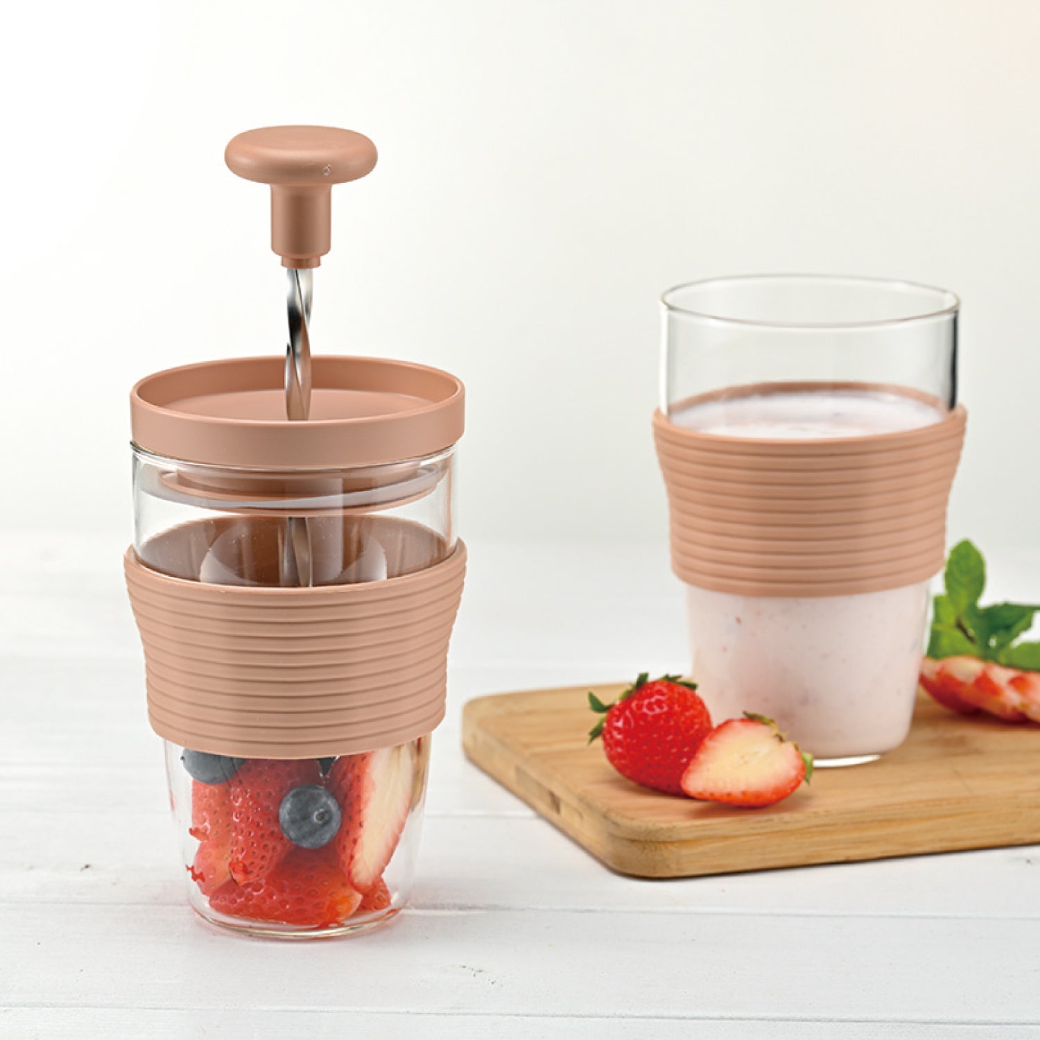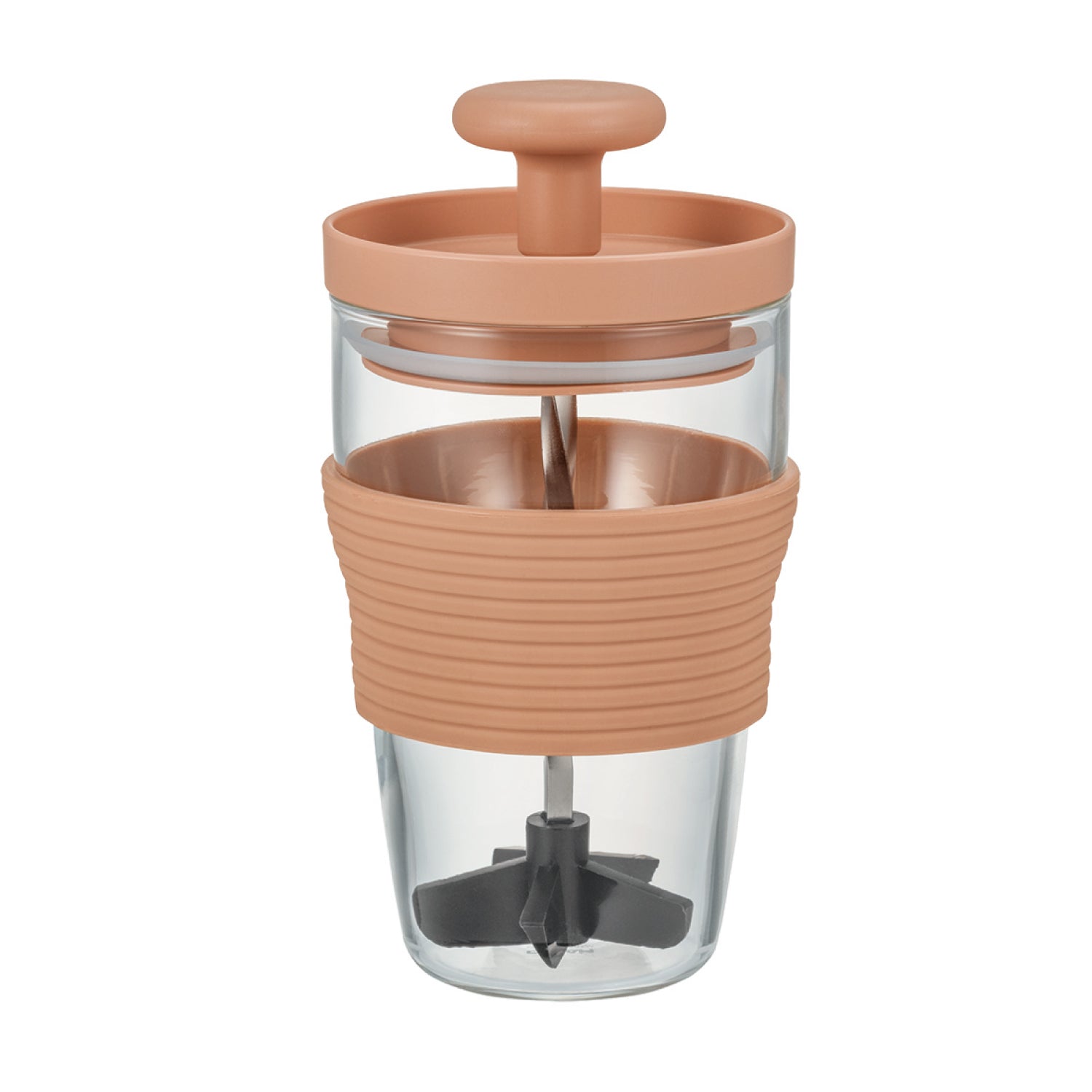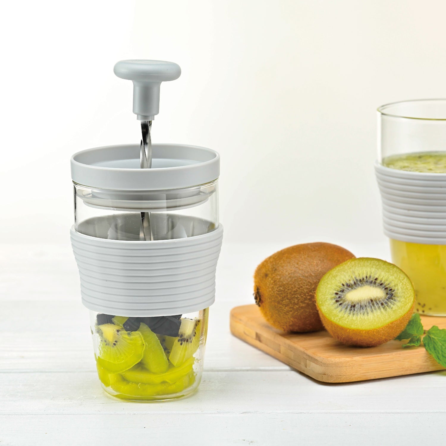 フレッシュジュースが手軽につくれる、ハンディージューサー。※熟していない果物や硬い食材は潰れない場合があります。パーソナルタイプのハンディージューサーです。スパイラルシャフトを上下させる事により刃の部分が回転して果肉をすり潰し、撹半します。一杯分のフレッシュなジュースを手軽につくり、そのまま本体をグラスとして使用できます。手軽にお好みのフレッシュジュースをお楽しみいただけます。