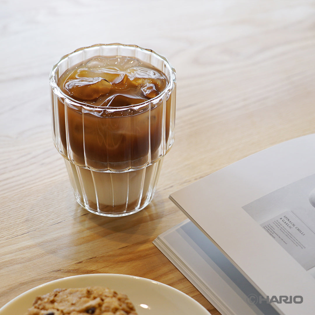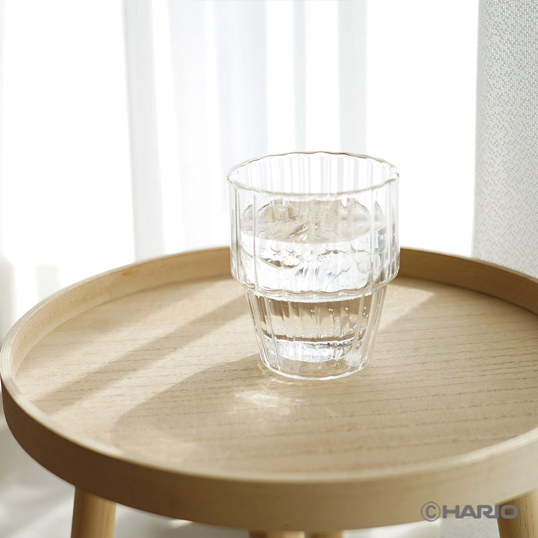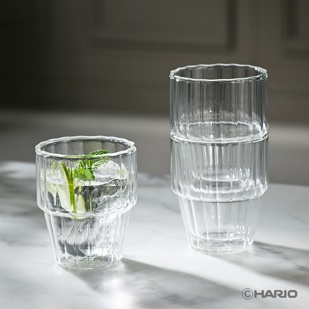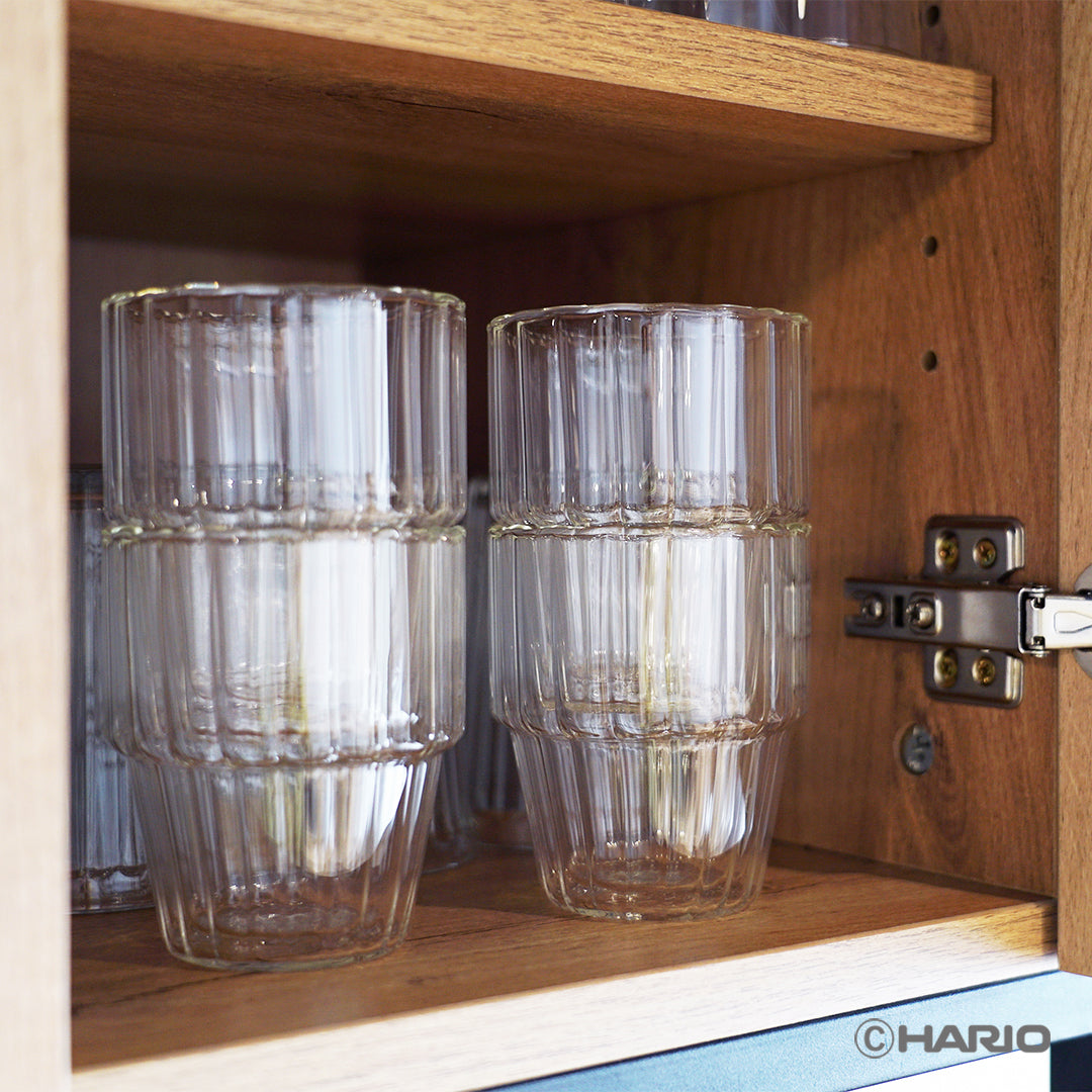 縦のラインが涼し気なダブルウォールスタックグラス。ダブルウォールなので冷たい飲み物も結露せずにお使いいただけます。温かい飲み物は手に熱さが伝わりにくいので安心して持つことができます。スタッキングと収納が可能なので収納スペースをとりません。容量:300mL