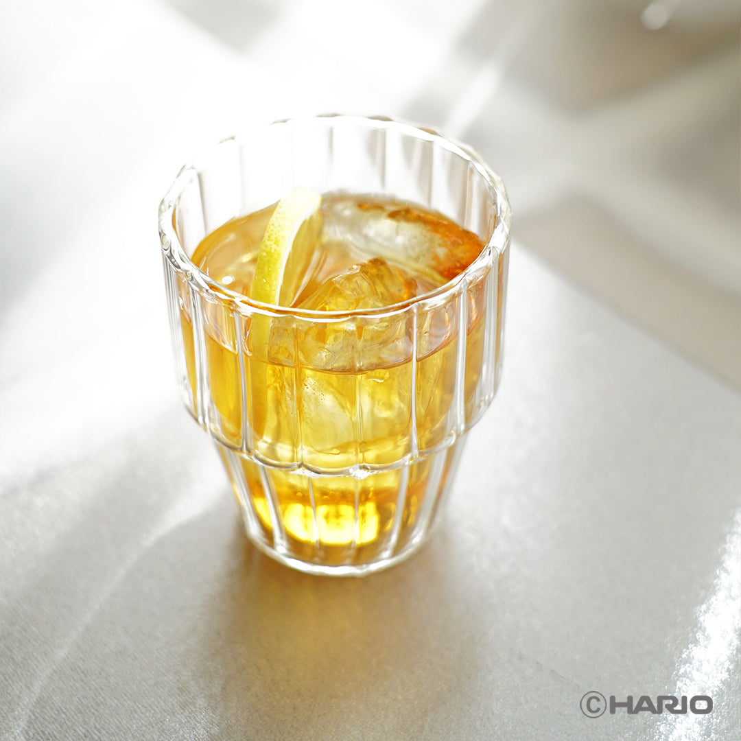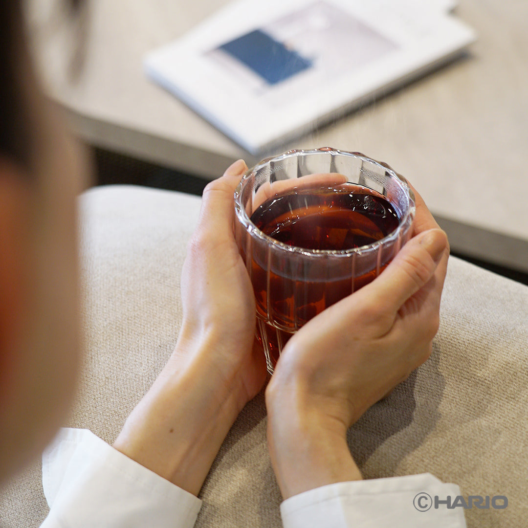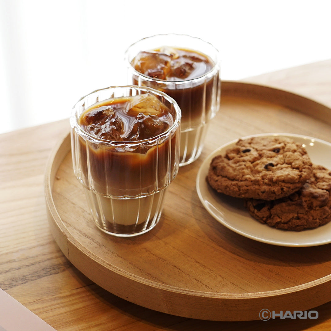 縦のラインが涼し気なダブルウォールスタックグラス。ダブルウォールなので冷たい飲み物も結露せずにお使いいただけます。温かい飲み物は手に熱さが伝わりにくいので安心して持つことができます。スタッキングと収納が可能なので収納スペースをとりません。容量:300mL