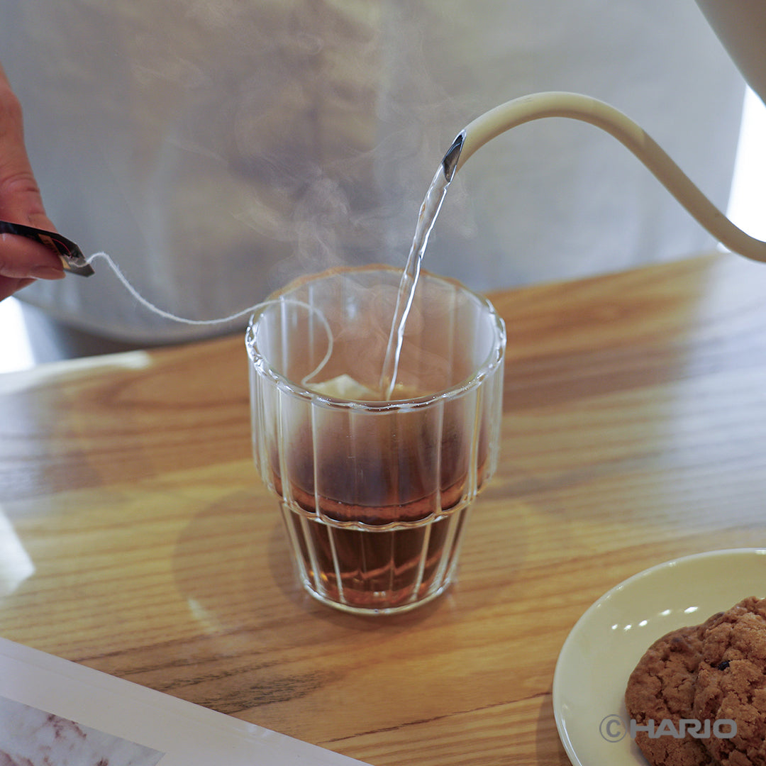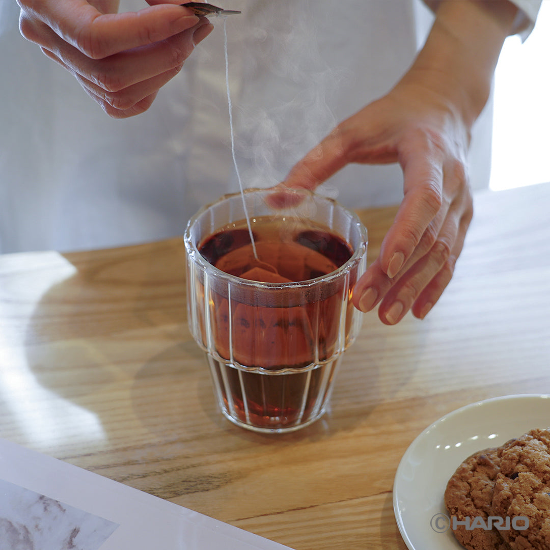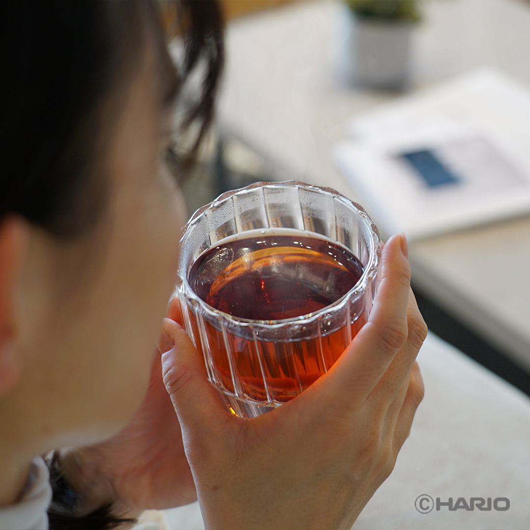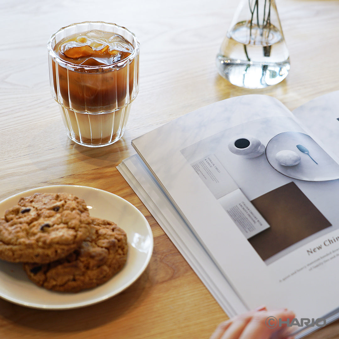 縦のラインが涼し気なダブルウォールスタックグラス。ダブルウォールなので冷たい飲み物も結露せずにお使いいただけます。温かい飲み物は手に熱さが伝わりにくいので安心して持つことができます。スタッキングと収納が可能なので収納スペースをとりません。容量:300mL