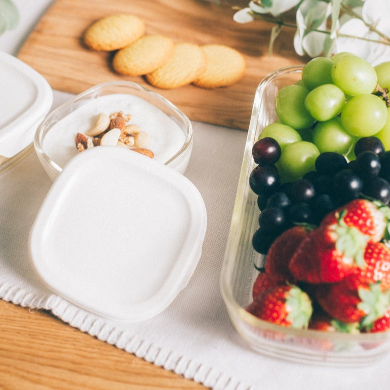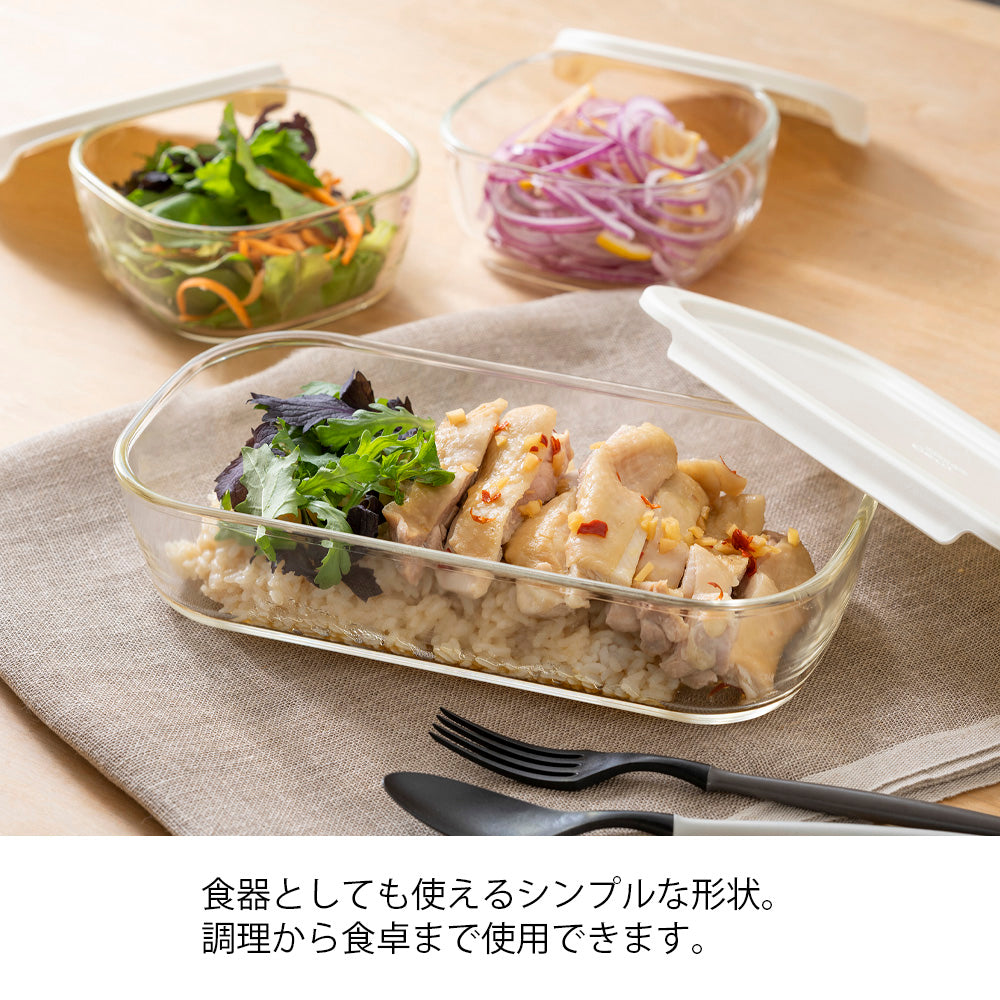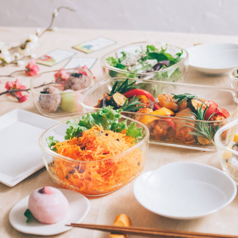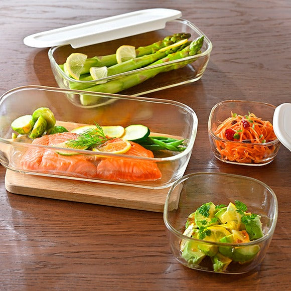 ガラスの保存容器の種類が豊富なセット♪電子レンジ使用可能。少し残ったおかずなどの保存や作り置きおかずなど、用途に合わせて選べるサイズ展開です。角はフタを外してオーブンでの使用もでき、より幅広く調理や保存に使用できます。