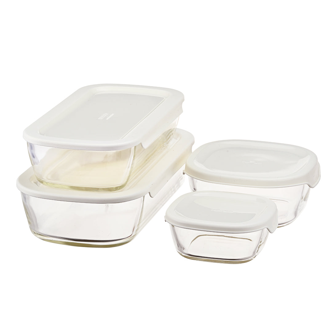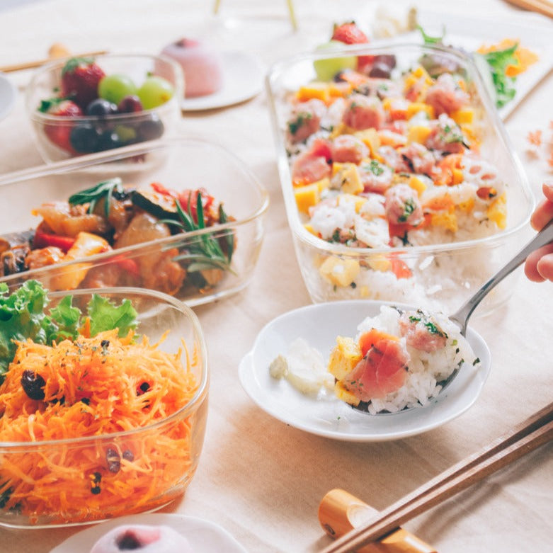 ガラスの保存容器の種類が豊富なセット♪電子レンジ使用可能。少し残ったおかずなどの保存や作り置きおかずなど、用途に合わせて選べるサイズ展開です。角はフタを外してオーブンでの使用もでき、より幅広く調理や保存に使用できます。