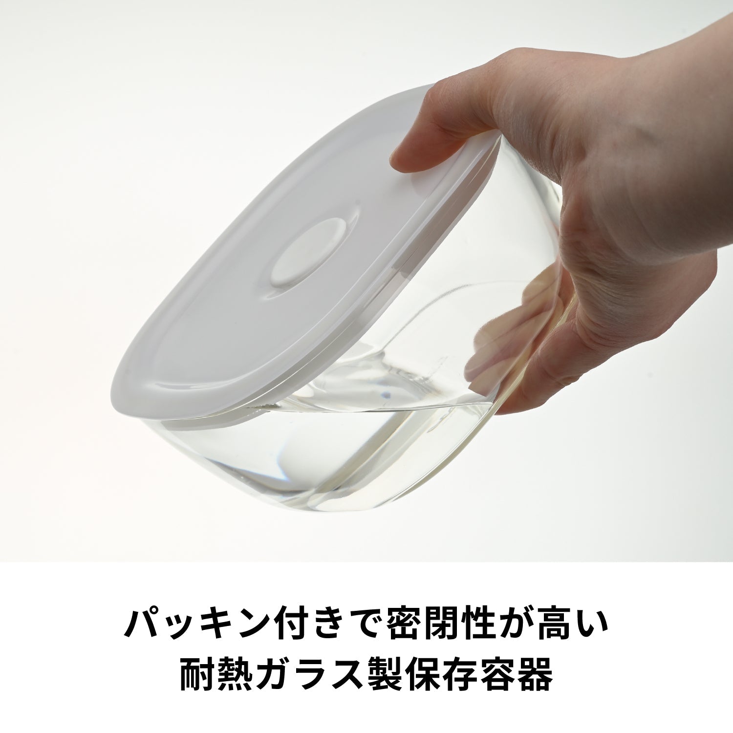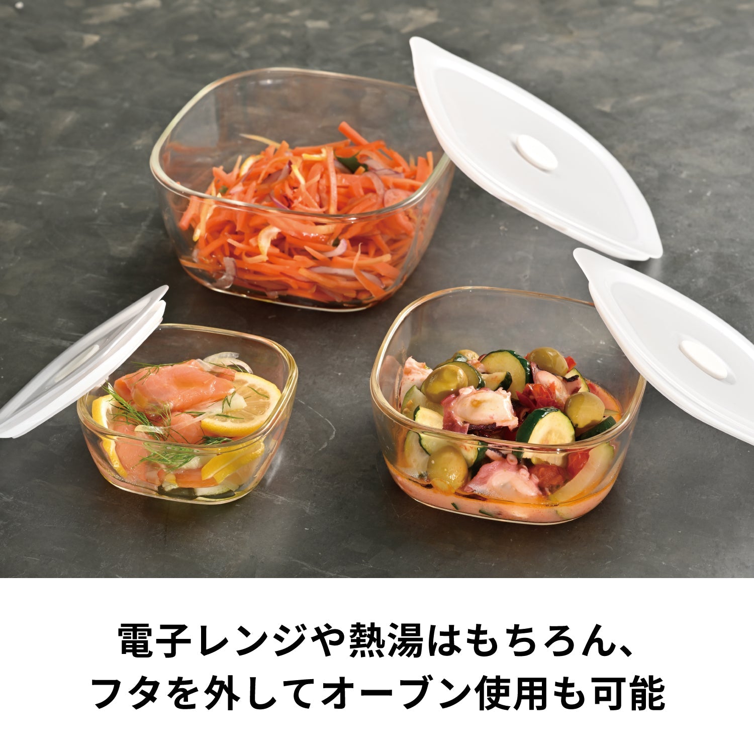 耐熱ガラス製密閉保存容器 角 はパッキンがついているので密閉性の高い保存容器です。フタの空気弁を上に引き上げると電子レンジでの使用が可能です。保存する場合は空気弁を下に押し下げます。フタを外してオーブン使用も可能です。※6個入りの箱に入っているため、6個未満をご購入の際はエアパッキンで梱包し発送いたします(8個ご購入の場合は6個入りの箱1つと2個はパッキンで梱包いたします)。