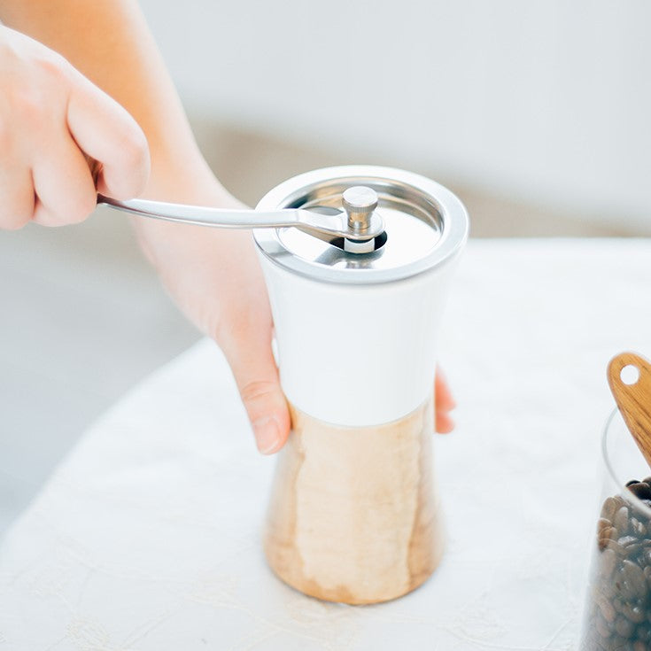 セラミック製ホッパーにオリーブウッドの粉受けを組み合わせたナチュラル感漂うコーヒーミルです。