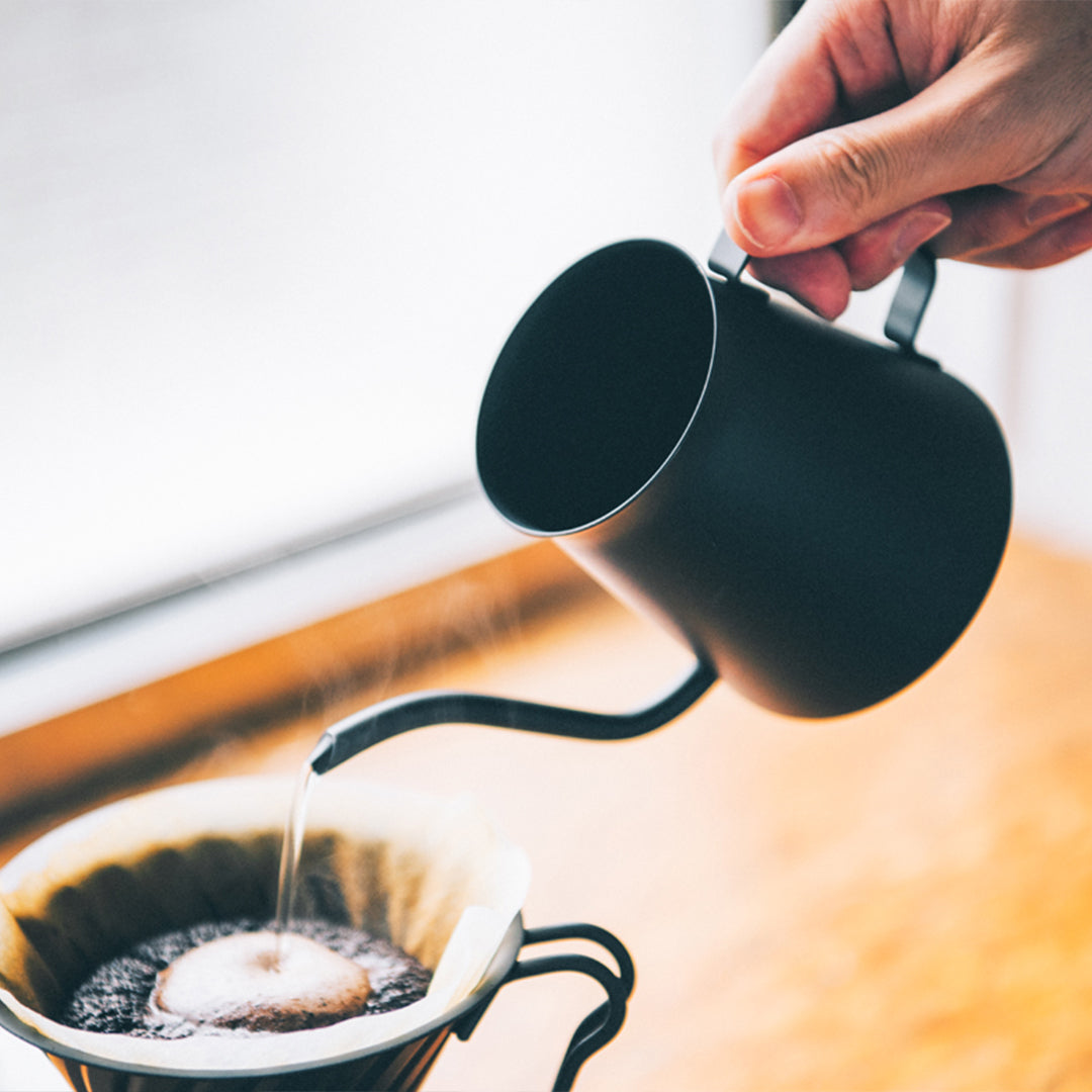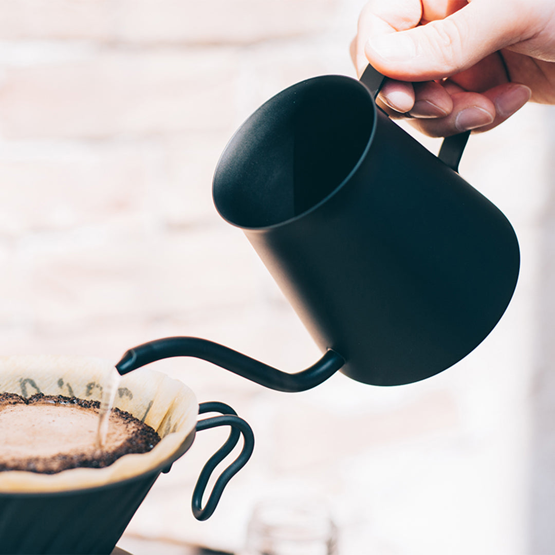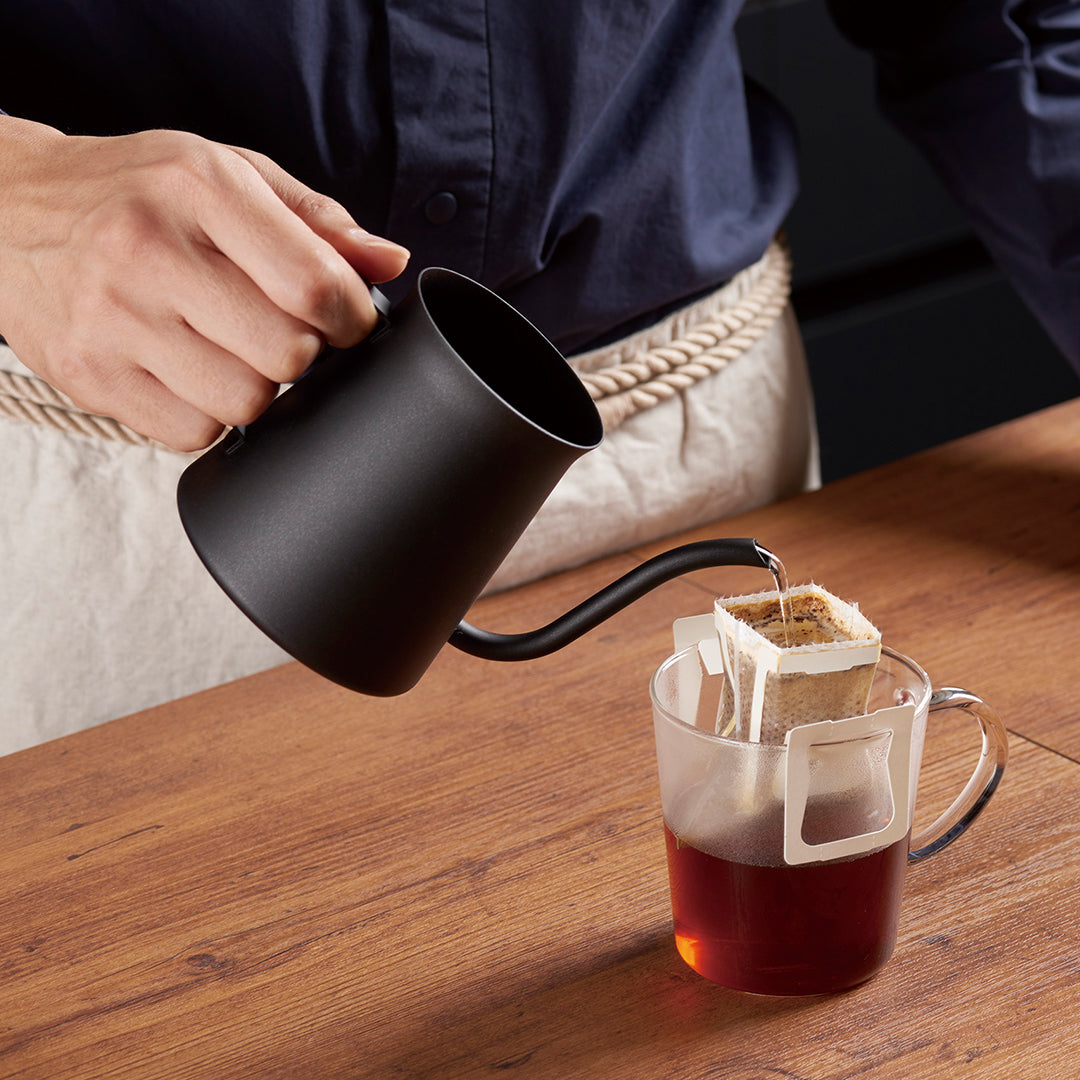1杯分のドリップを手軽に行うためのミニドリップケトルです。熱湯用です。直火・IH等の熱源ではご使用できません。実用容量300mL