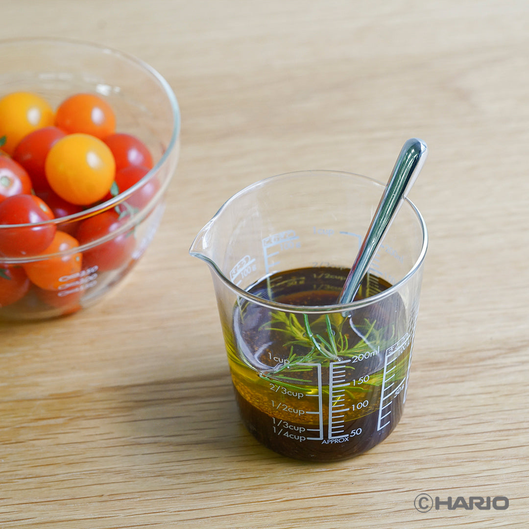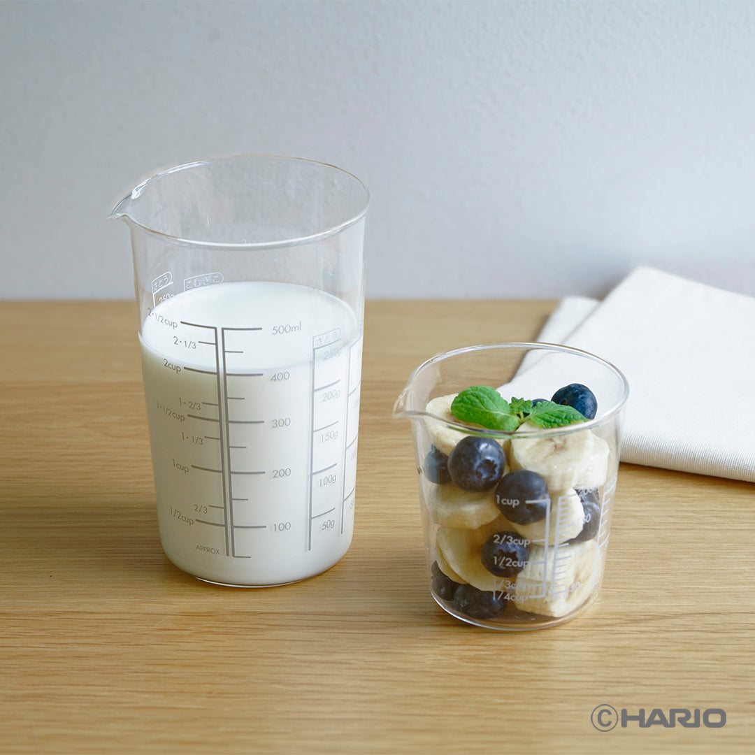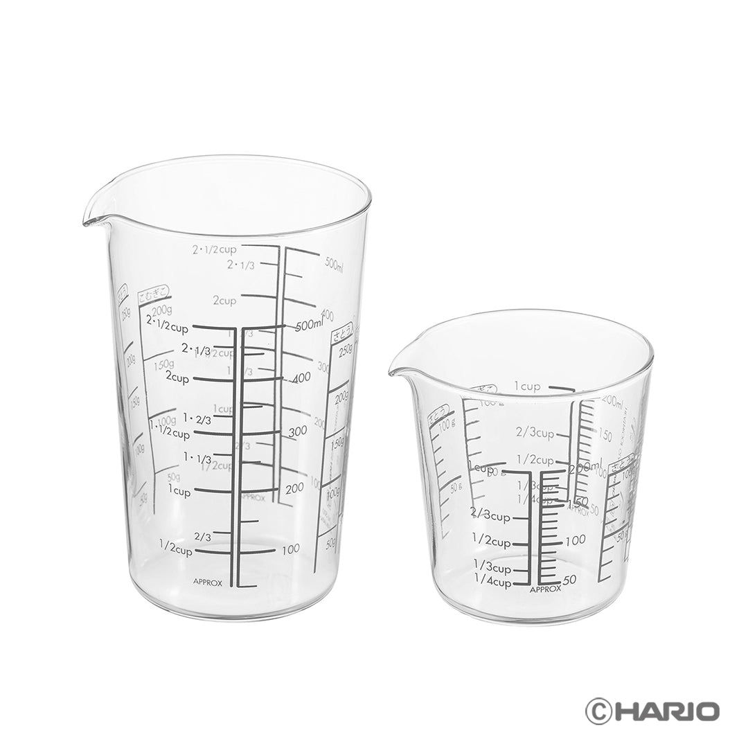 ちょっとした計量や、調理にも。耐熱ガラス製なので、湯せんや電子レンジなど温めながらの調理にも安心して使えます。200mL/500mLサイズの2点セット。