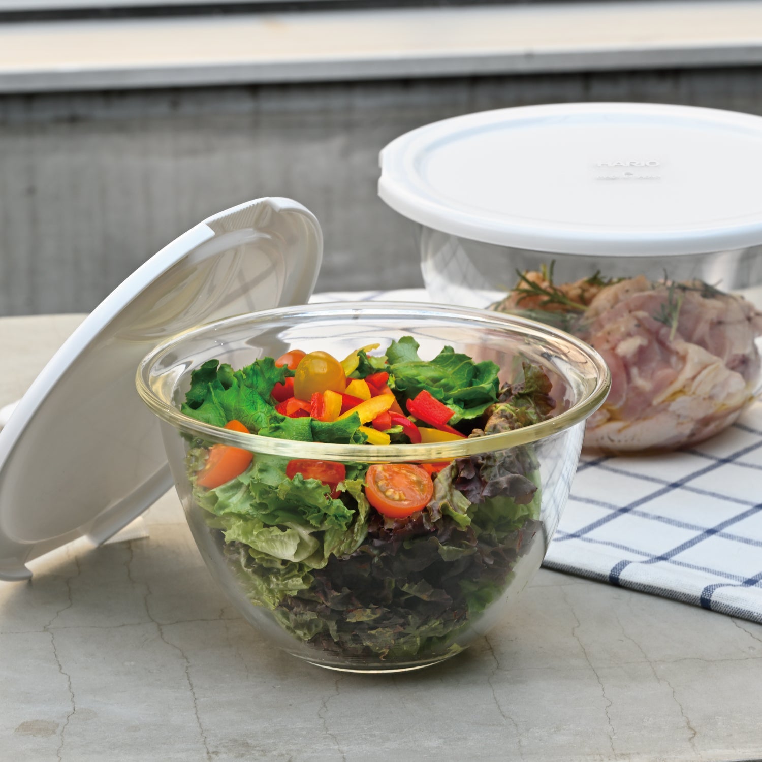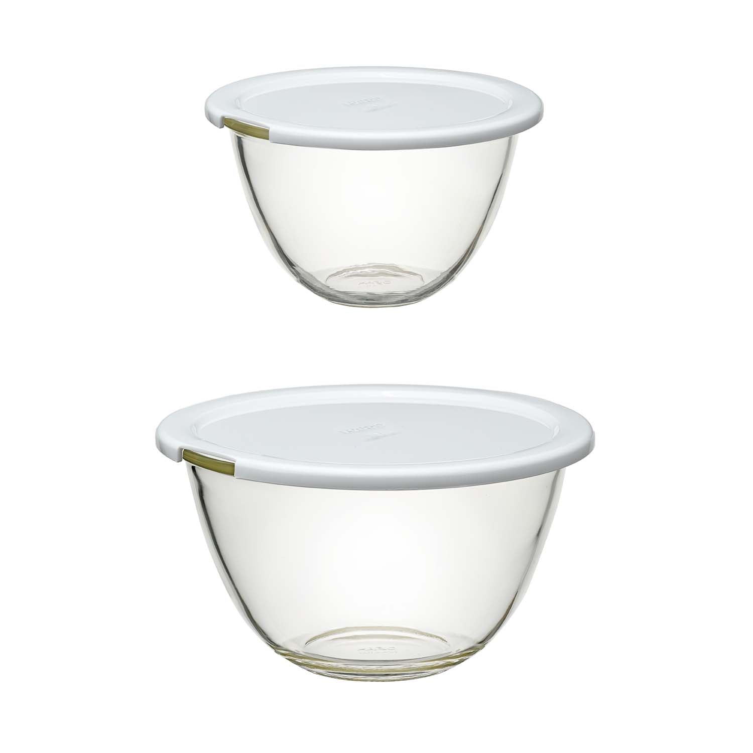 耐熱ガラスボウルにレンジフタが付きました。2個セットで入れ子収納が可能。
