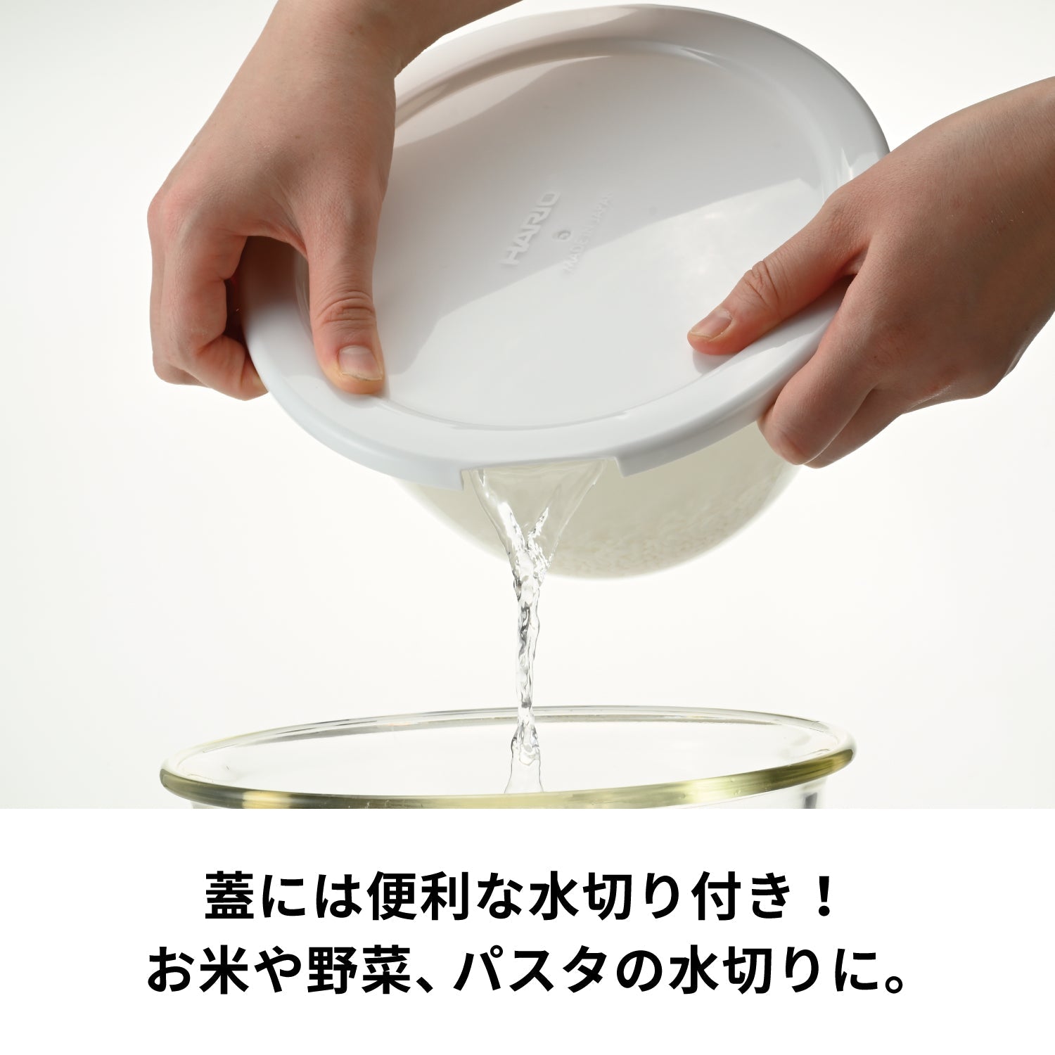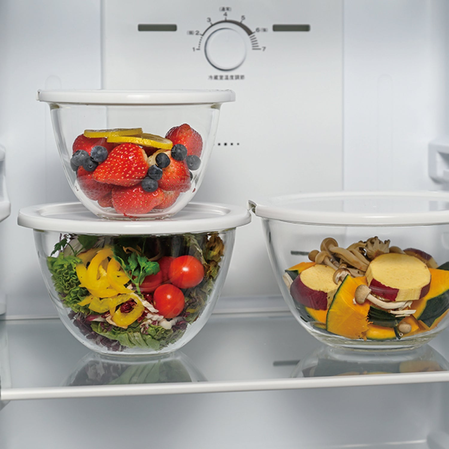 耐熱ガラスボウルにレンジフタが付きました。3個セットで入れ子収納が可能。