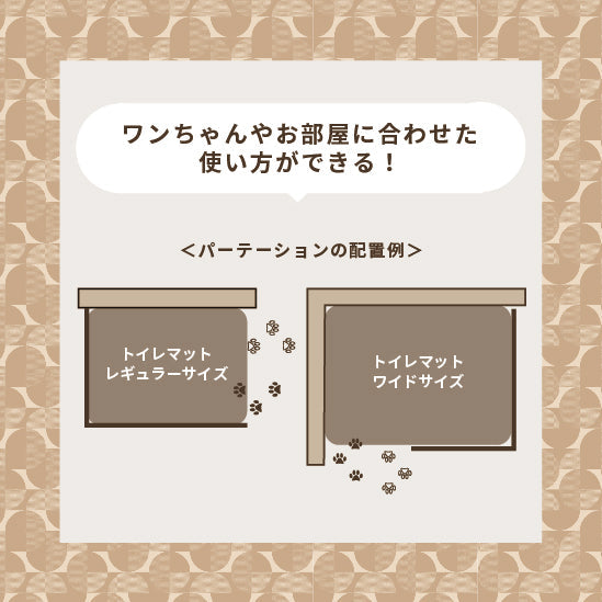ワンコトイレマットシリーズに組み合わせて使用できる『ワンコトイレパーテーション』が登場。はみ出しが心配なフラットタイプのトイレでも、お部屋の美観を保ちながらワンちゃんのトイレ成功率をアップさせることができます。組み合わせ方も自由自在。※こちらはトイレ パーテーション のみの商品となります。(1枚)。※1枚目の写真はワンコトイレマットレギュラーでの使用イメージとなります。※ワンコトイレマット全サイズにご使用頂けます。
