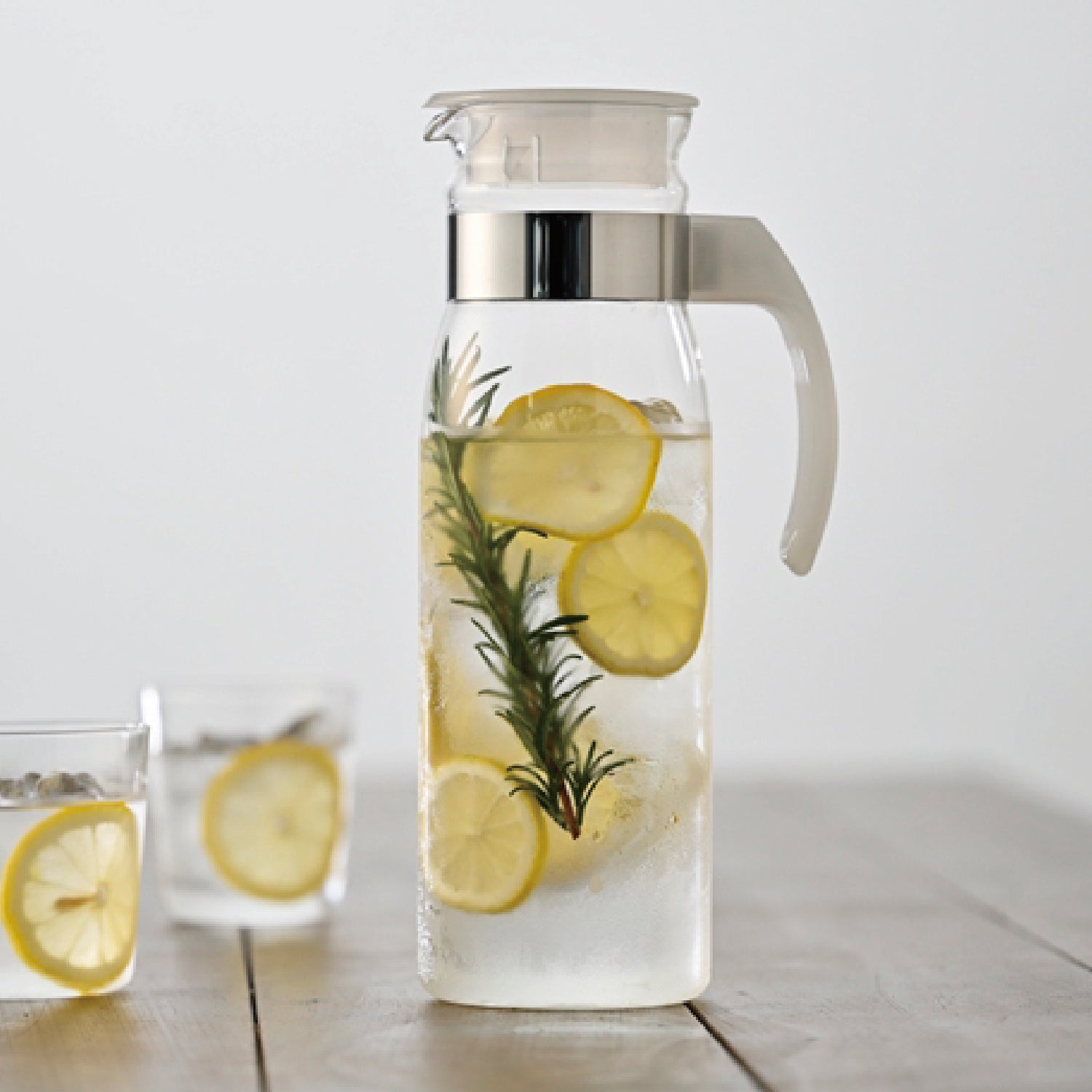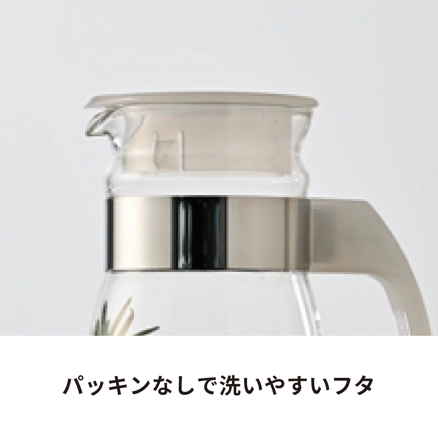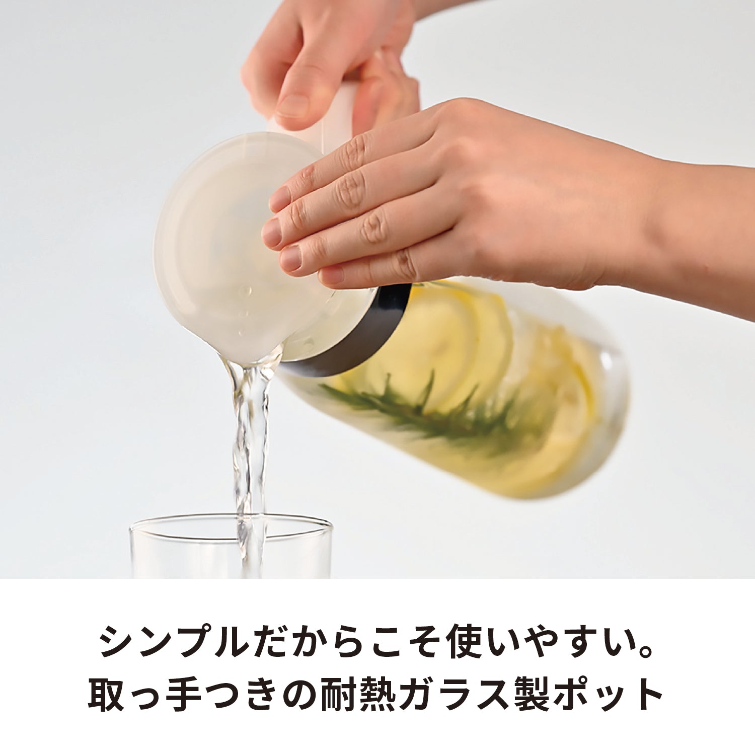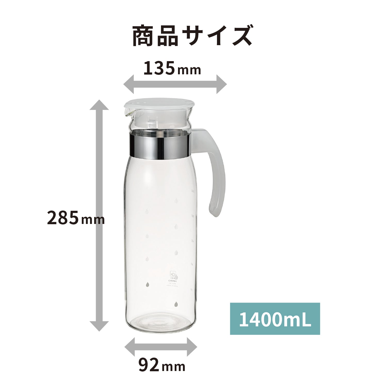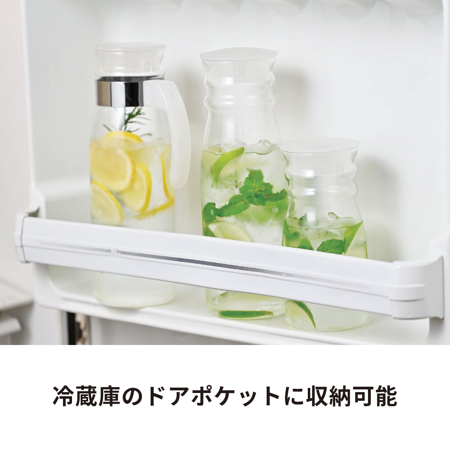 注ぐのに便利な取っ手付きの冷蔵庫ポット。シンプルで使いやすく、冷蔵庫のドアポケットに収納可能です。個箱は付いていません。