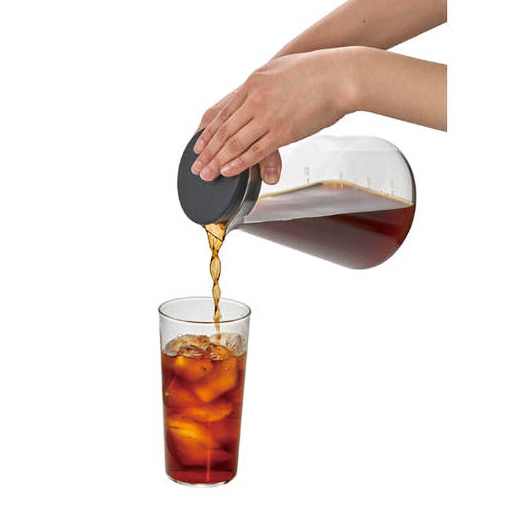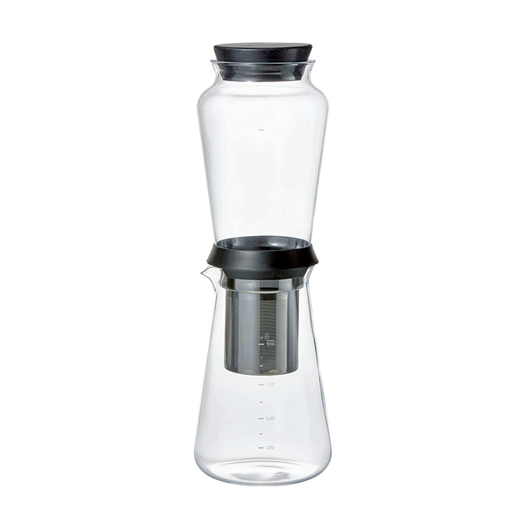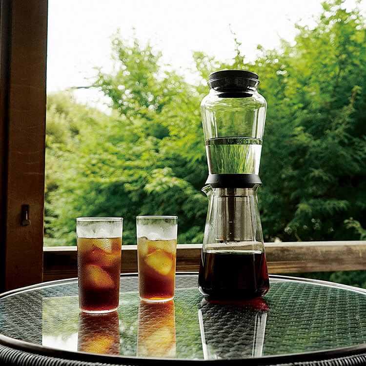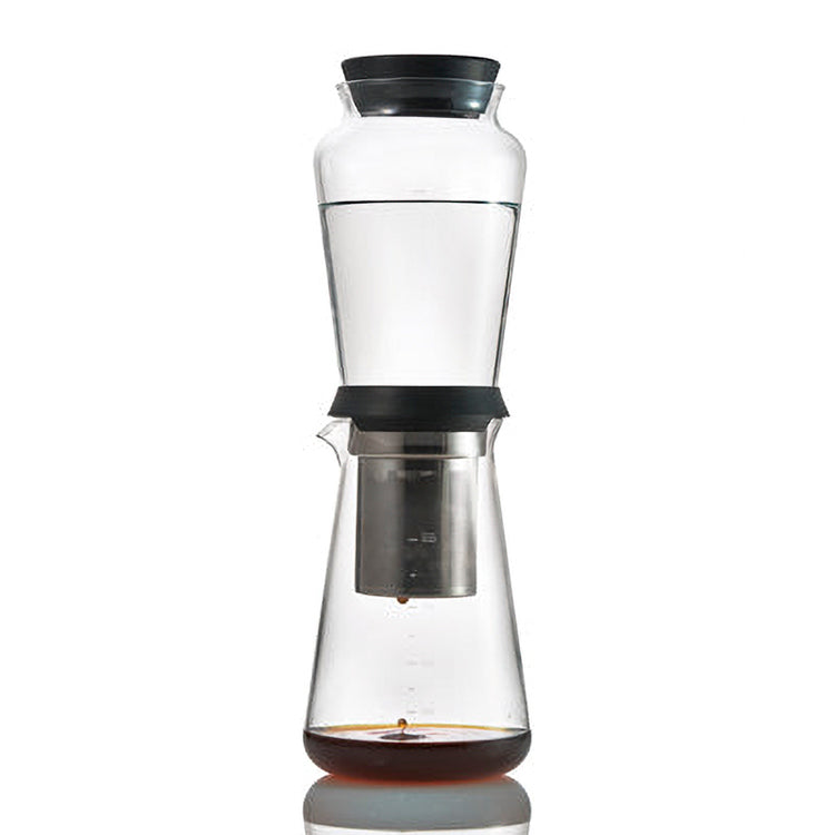 コニカルビーカー型のポットがかわいいシンプルなデザインの点滴式水出しコーヒー器具です。創業1921年。日本で唯一、耐熱ガラス工場を保有しているメーカーです。ガラスに限らず、家庭で便利に愛される商品づくりを目指して、さまざまな素材を用いて幅広い商品展開を行っています。上ボールに水を入れると、点滴パーツの2つのスリットから水が流れて滴下します。スピード調整なしで約1時間前後で落ちきるため、手軽に本格水出しコーヒーをお愉しみいただけます。コーヒー以外に水出しのお茶用としてもお使いいただけます。