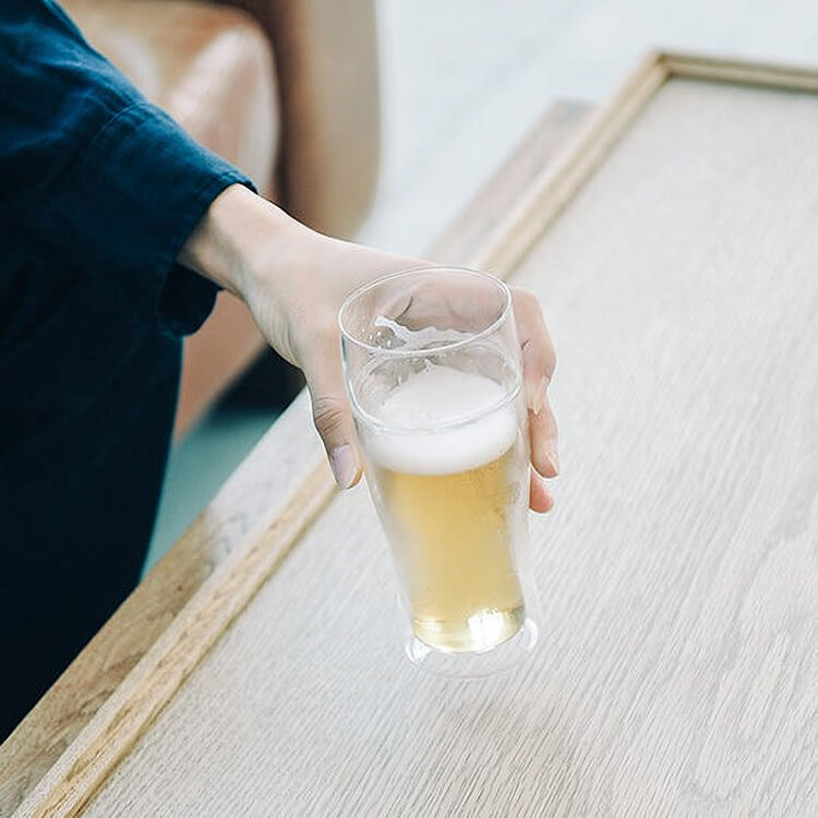 注いだドリンクが浮いているように見えるスタイリッシュなビアグラス。2層のガラスで作られているため保温・保冷に優れています。創業1921年。日本で唯一、耐熱ガラス工場を保有しているメーカーです。ガラスに限らず、家庭で便利に愛される商品づくりを目指して、さまざまな素材を用いて幅広い商品展開を行っています。ガラスが二重になっているので、熱い飲み物でも持ちやすく、また冷たい飲み物のときは結露を防ぎます。飲み口は1重で口当たりも良く、飲み物の温度が分かります。