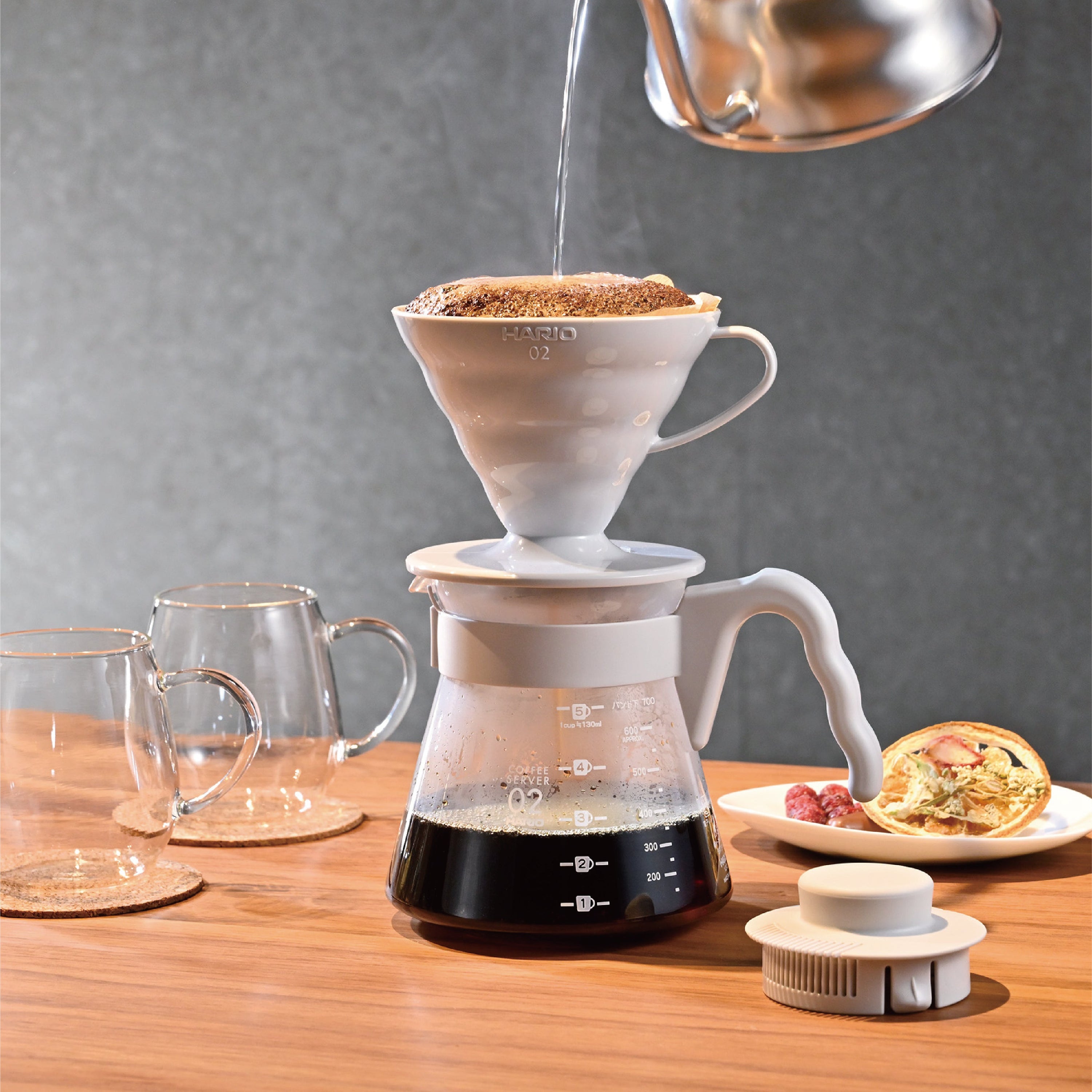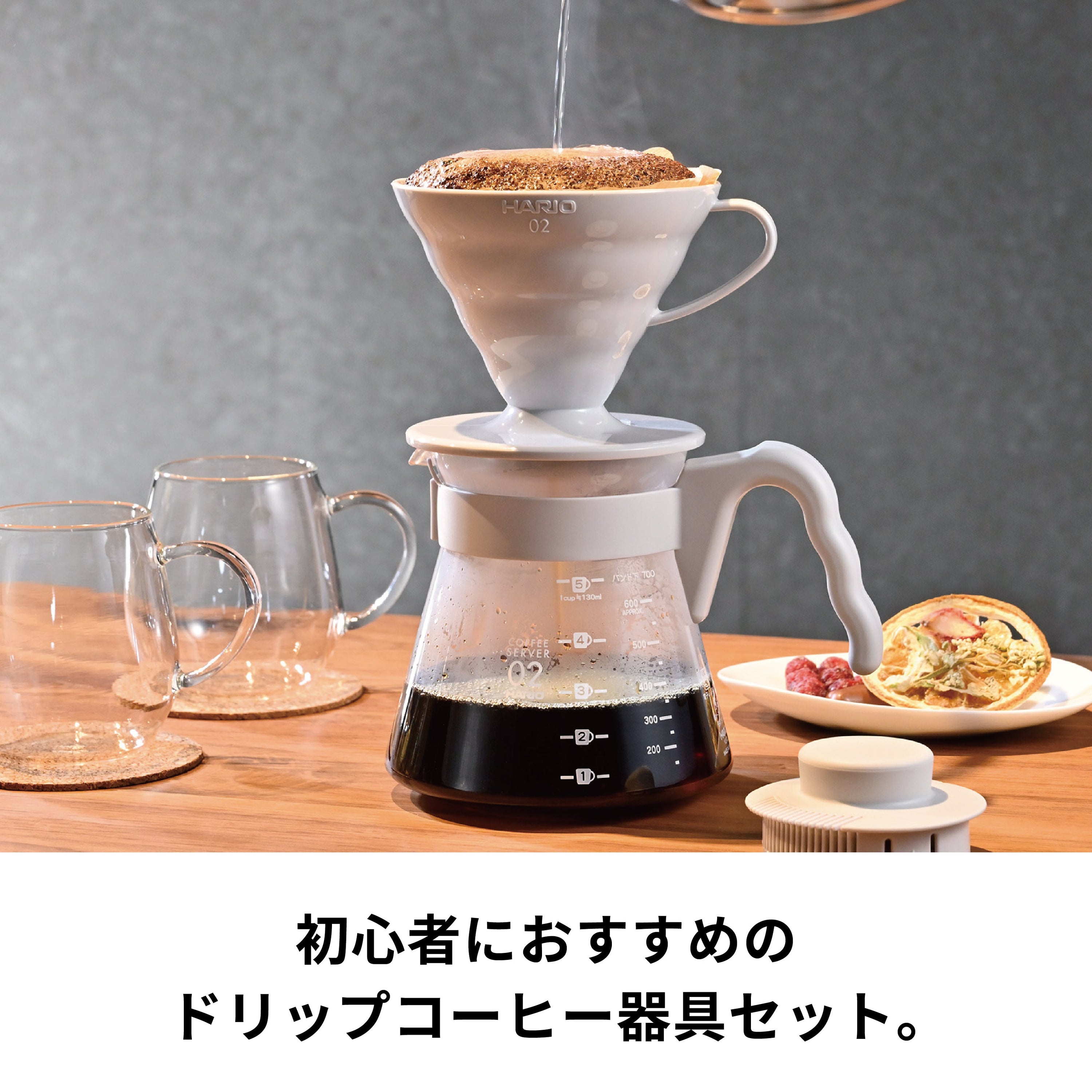 V60シリーズに新たにカラードリッパーセットが新発売。サーバー・ドリッパー・ペーパー・計量スプーン付き。円すい形ペーパーでネルドリップの極上な味わい。スパイラルリブが決め手です。