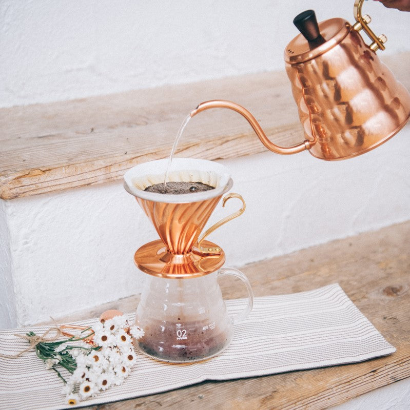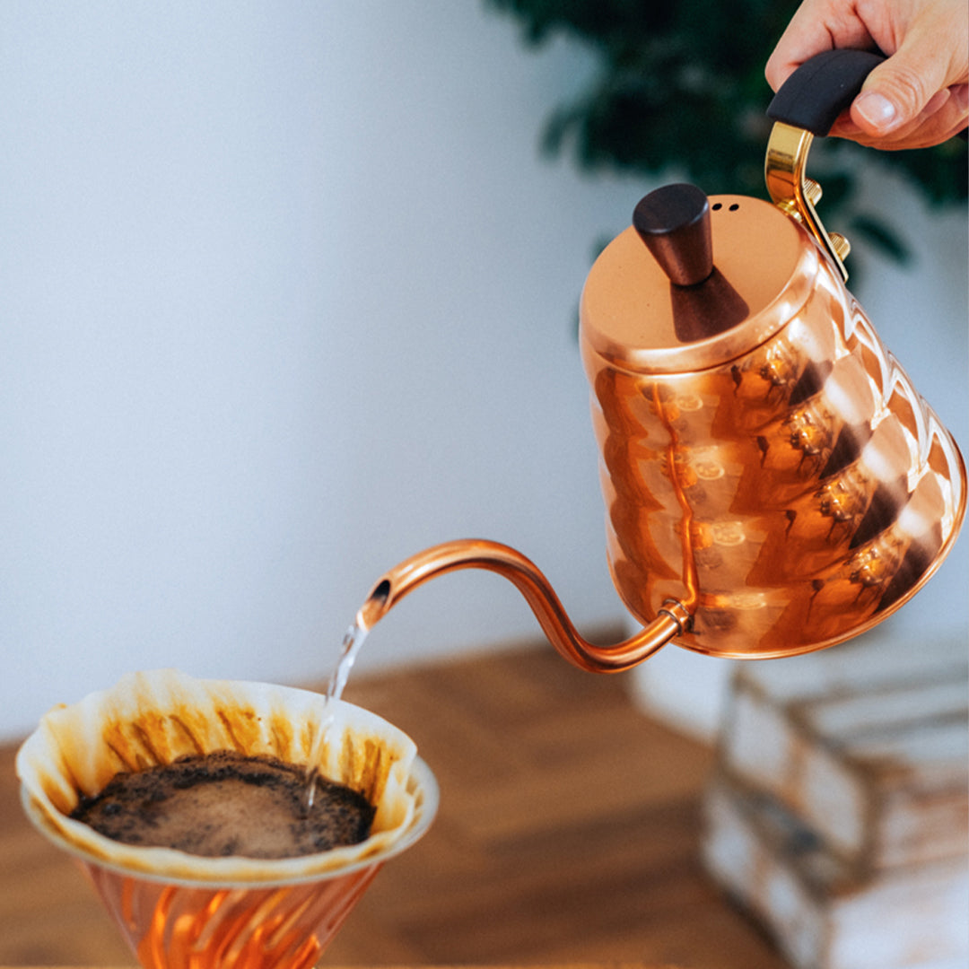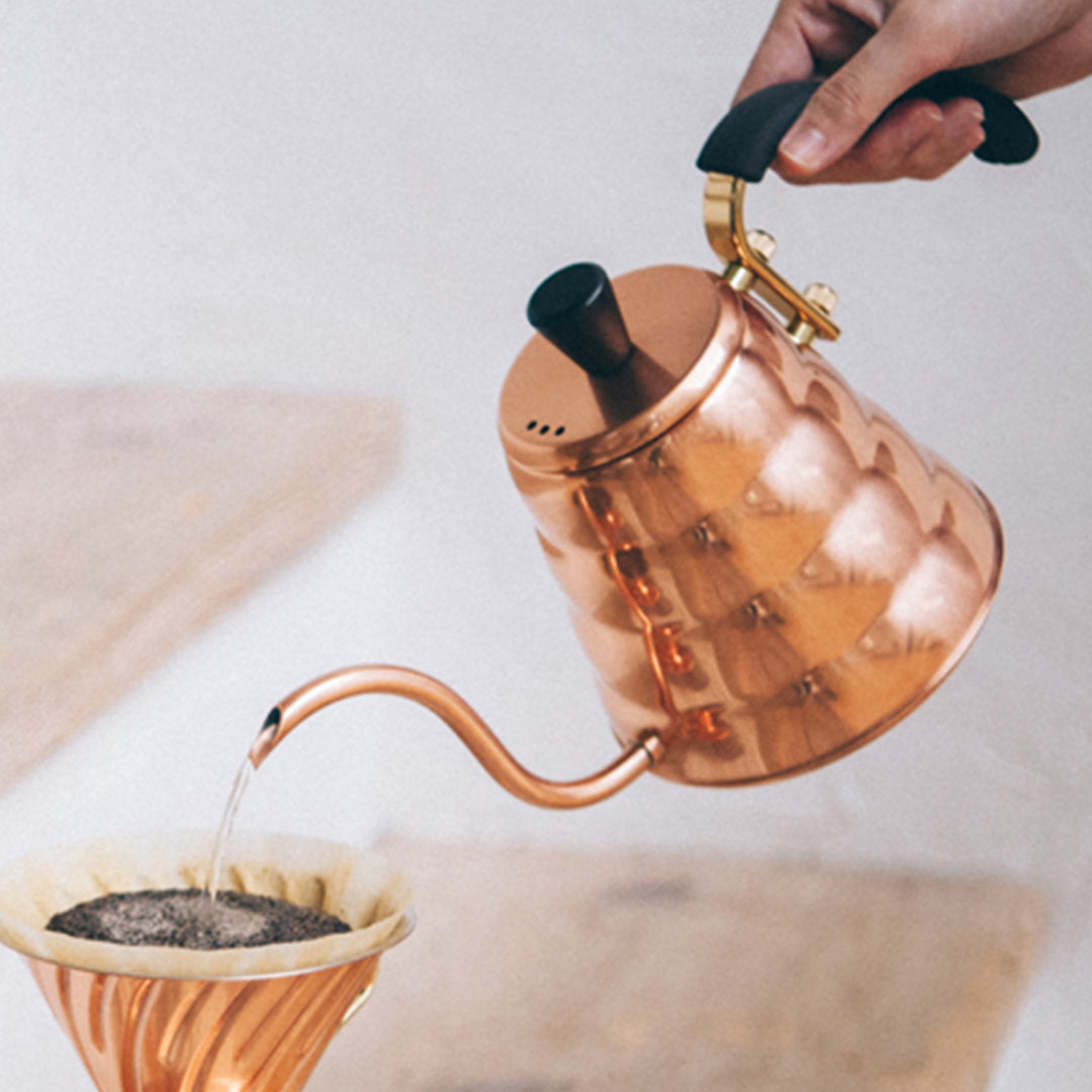 注ぎ口の細いケトルはお湯の量やスピードがコントロールしやすいのが特徴です。※取っ手カバー付き。
