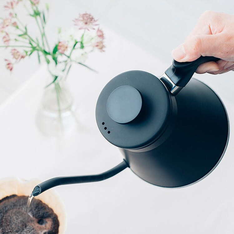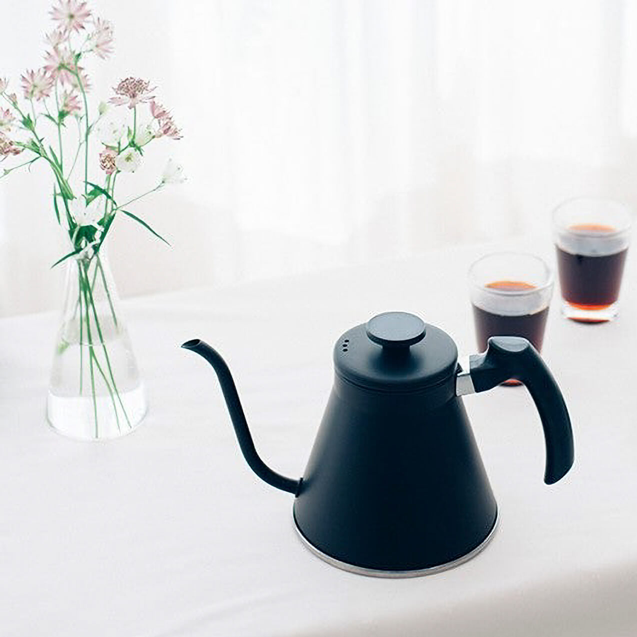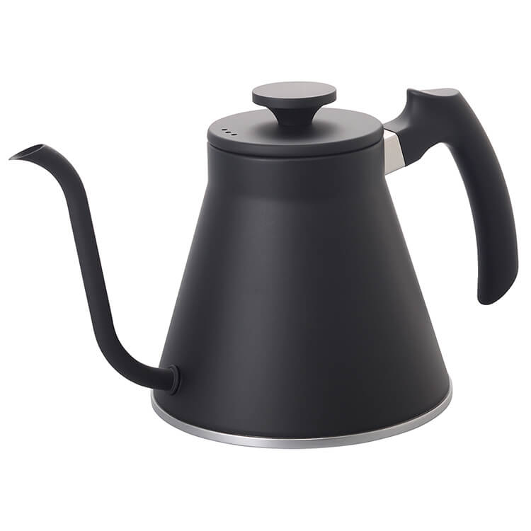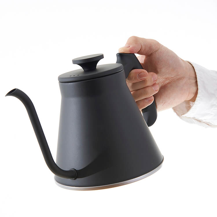 マットブラックとヘアラインシルバーがクールな印象の細口のドリップケトル。コーヒードリップシーンに「フィット」するケトルです。創業1921年。日本で唯一、耐熱ガラス工場を保有しているメーカーです。ガラスに限らず、家庭で便利に愛される商品づくりを目指して、さまざまな素材を用いて幅広い商品展開を行っています。注ぎ口の細いドリップケトルはお湯の量やスピードがコントロールしやすく、おいしいコーヒーを淹れるのに役立ちます。ハンドルは親指をハンドル上部にのせて使用したり、しっかりにぎるように持つこともできます。ドリップしやすさを考えた形状に仕上げました。フタはフラットツマミなので逆さにして安定して置くことができます。