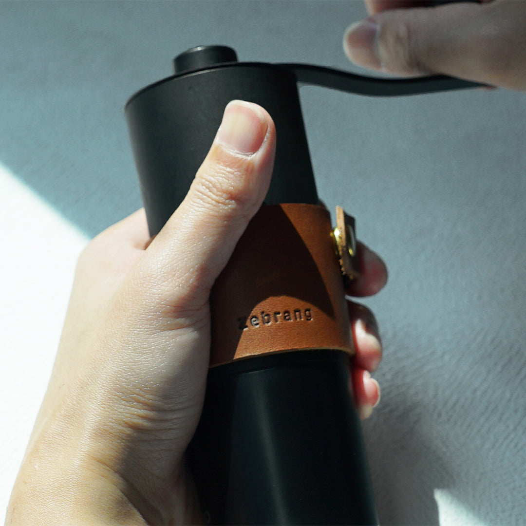 「ゼブラン コーヒーミルステンレスカッター」専用のハンドルホルダー上質なレザーで、コーヒーを淹れる瞬間も贅沢に。高品質なイタリアンレザーを使用したレザーハンドルホルダーは3色展開。通常のシリコーンバンドよりも、スリムな幅でハンドルを収納できます。ハンドルがボタンでしっかり留まるから、持ち運びのときもハンドルを失くしません。ミルと共に愛着を持って末永くご使用いただきたいアイテムです。使い込むほどに深まるレザーの風合いは、時間と共に美しく育ちます。レザーのぬくもりが、コーヒーを淹れる時間を特別なものに変えてくれます。※コーヒーミルは付属しておりません。