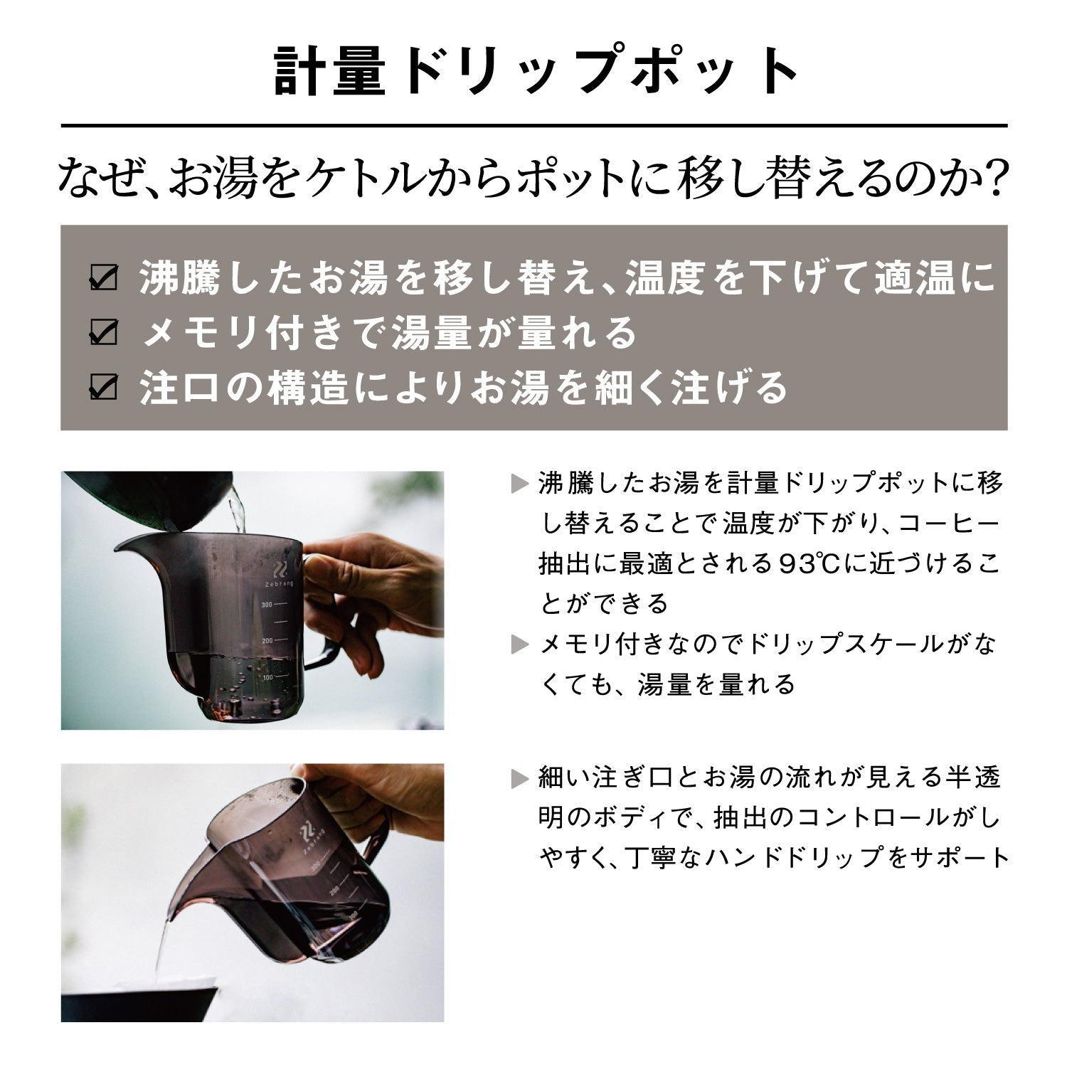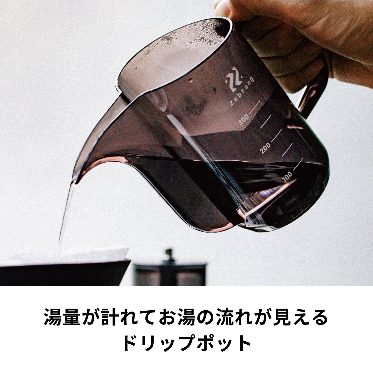 湯量が計れてお湯の流れが見えるドリップポットZebrang(ゼブラン)お湯の動きが見える半透明のデザインで抽出のコントロールがしやすくなり、ハンドドリップをサポートします。また、コーヒーをドリップする際はお湯を細く注ぐことが大切ですが、注ぎ口の先端が細いため、お湯を細く注ぎやすいデザインです。沸騰したお湯を計量ドリップポットに移し替えることでお湯の温度が下がり、コーヒーを淹れる際の推奨温度93度に近づけることができます。PCT樹脂製のため、落としても割れないほどの丈夫さと充分な耐熱性があります。欧米諸国では、赤ちゃんの哺乳瓶に使われている安心の素材です。