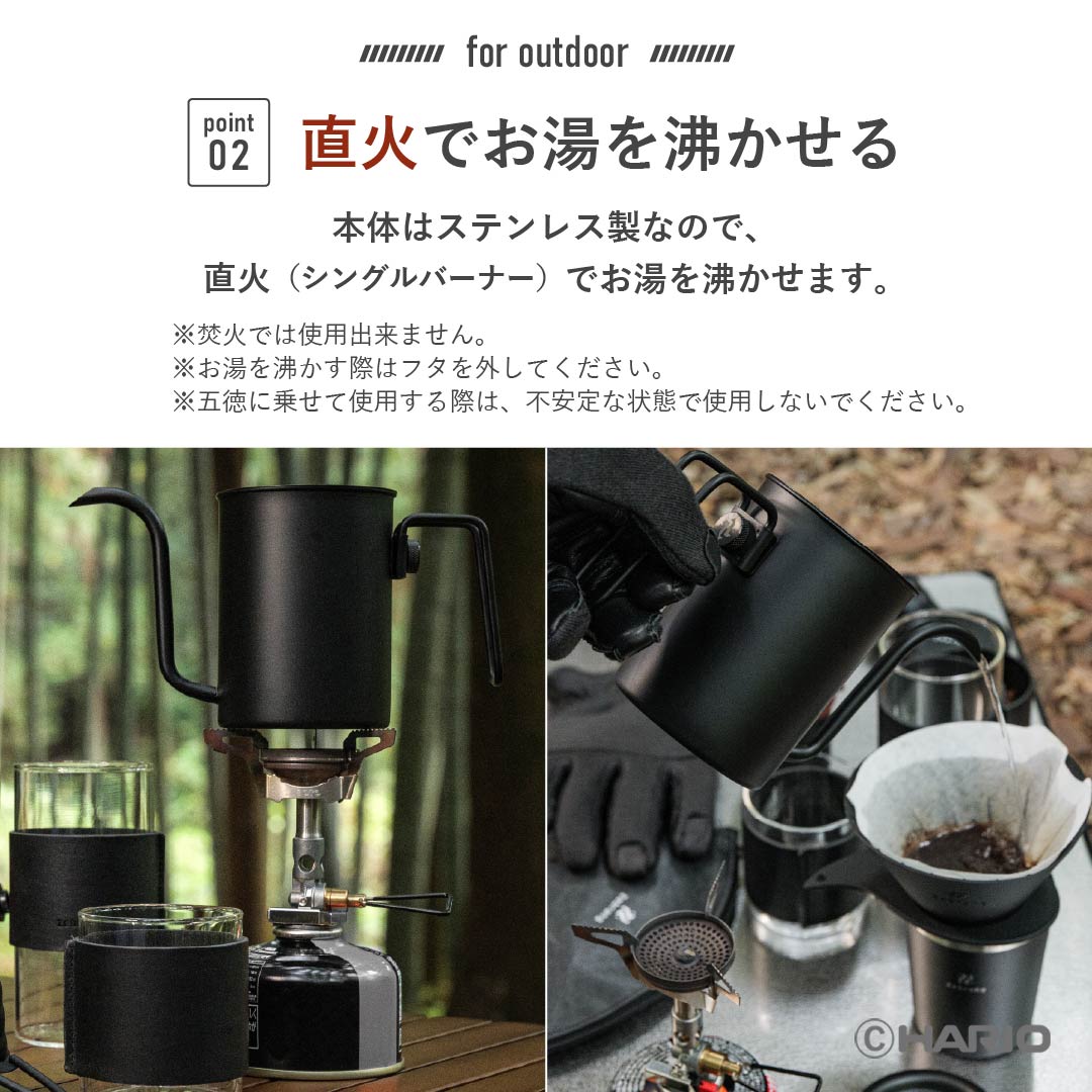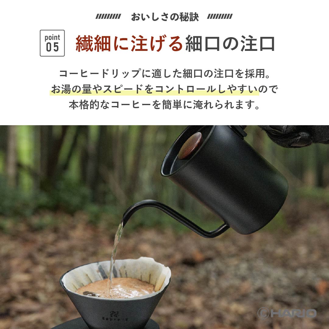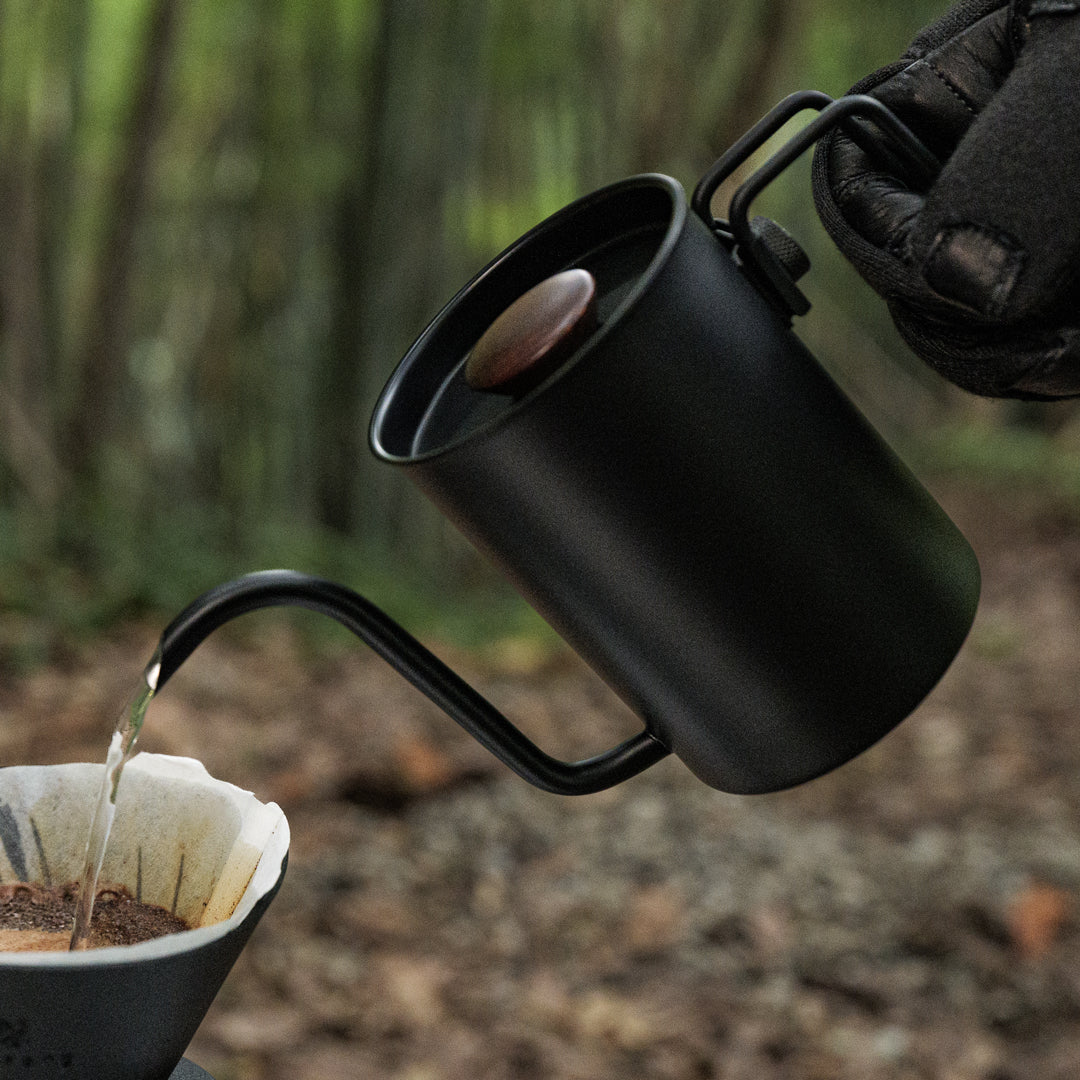 コーヒー専門メーカーが本気で作った、アウトドア用ミニドリップケトルです。こだわり抜いた注ぎ口の設計、スタッキング収納しやすいストレート形状、持ち運びに便利な収納袋付き、外でも自宅でも本格的なドリップが楽しめる<新アイテムです。