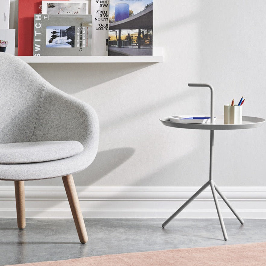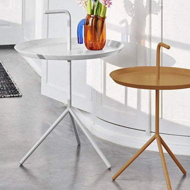 トップの取っ手を持つことで、部屋から部屋へ気軽に持ち運びができ、常にそばへ置いて使用することができるサイドテーブルです。カラー名に「ハイグロス」と記載がある場合、光沢のある塗装です。その他はマットな塗装です。