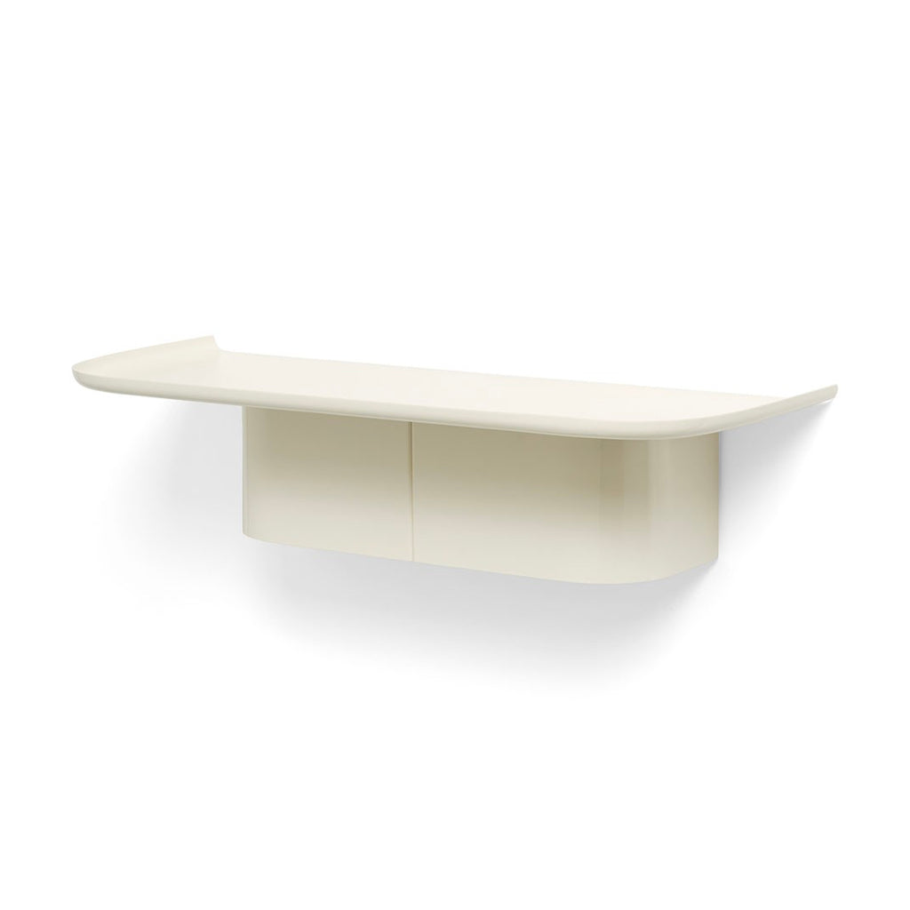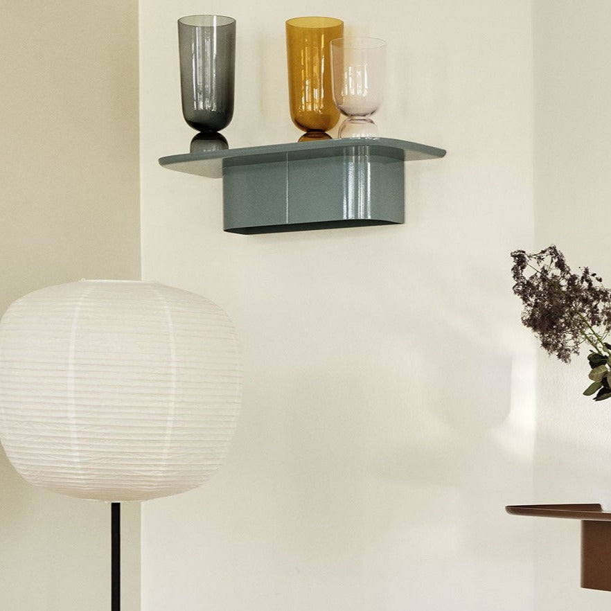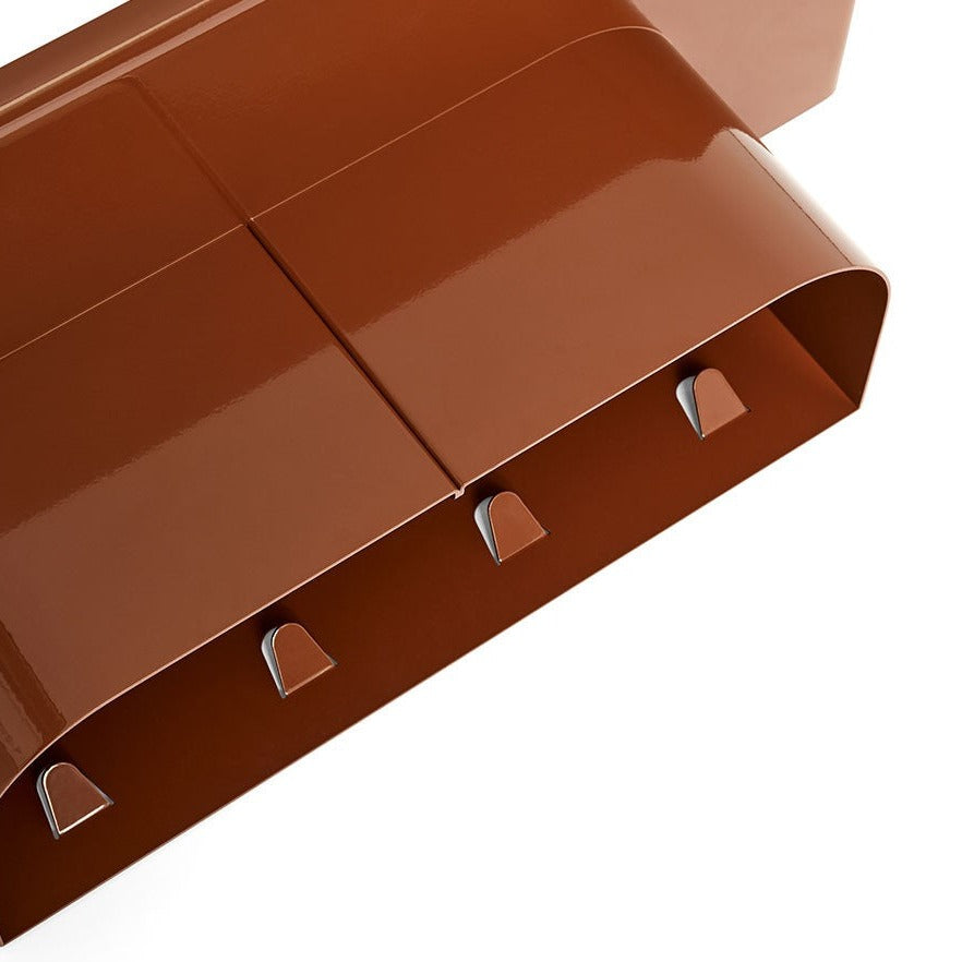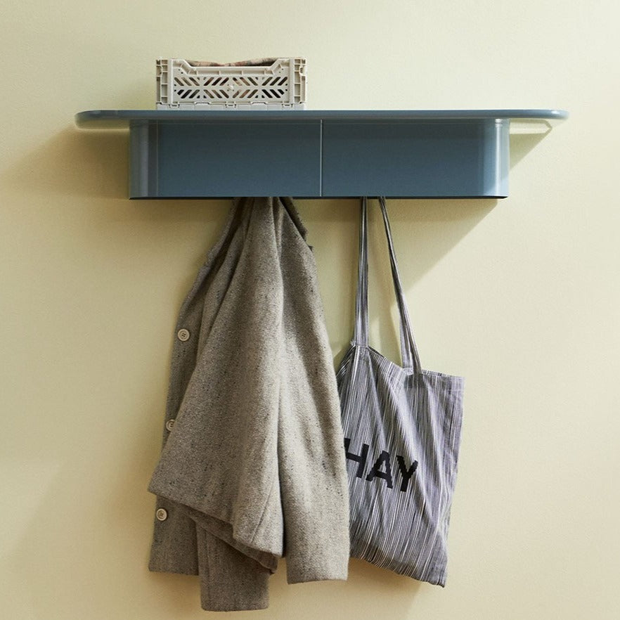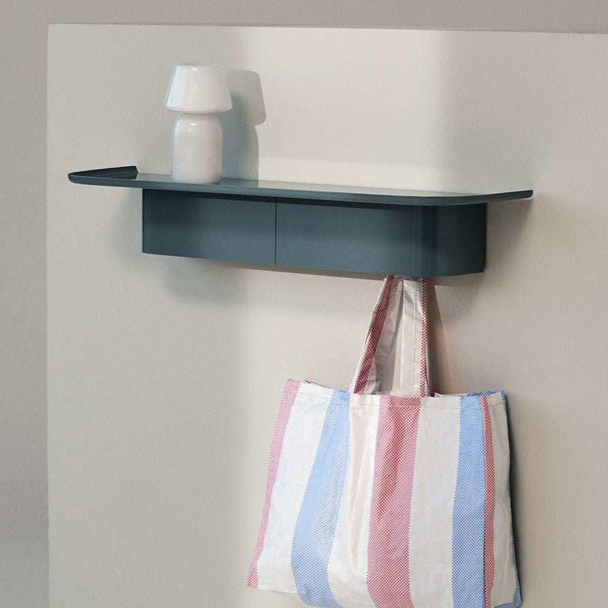 カラフルな壁掛けシェルフです。軽量で強度があり、何度も再利用できるアルミ板に、プレス加工とパンチング加工が施されています。背面にある鍵穴型のスリットによって壁に掛けられるようになっており、柱の内側に内蔵された4つのフックに物を吊り下げることもできます。