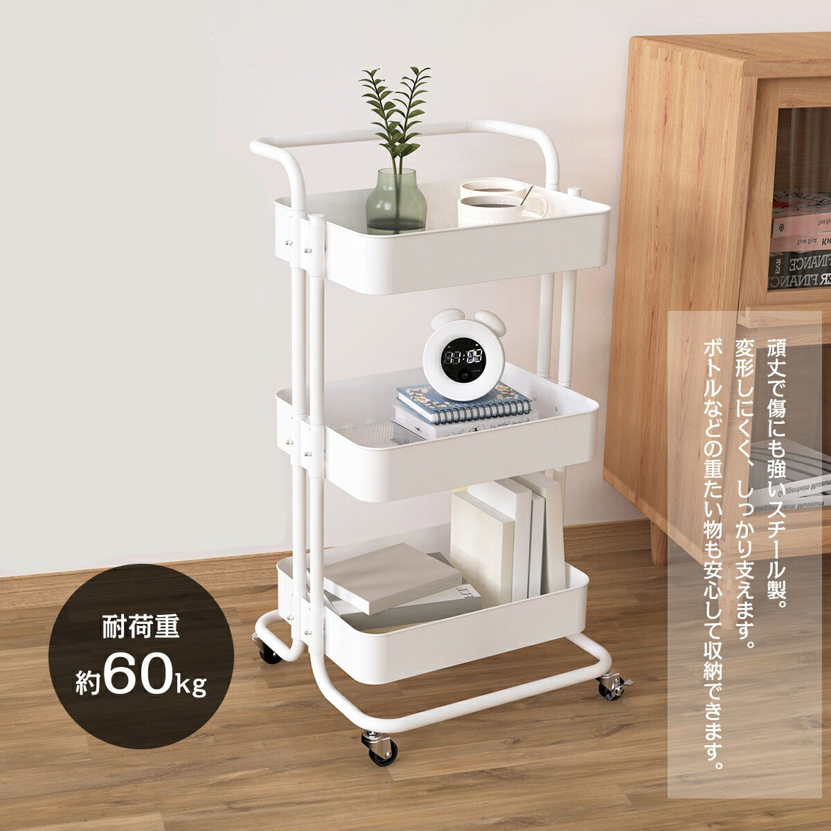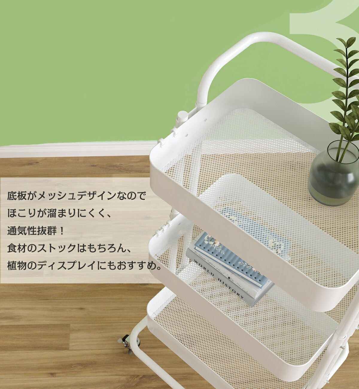 用途やスペースに合わせて2段もしくは3段に自由に変更することができるキッチンワゴンです。様々な道具や雑貨などの小物収納ができます。4脚中2脚にはストッパーが付いているので、固定したい時も安心です。底板がメッシュデザインなのでほこりが溜まりにくく、通気性抜群!食材のストックはもちろん、植物のディスプレイにもおすすめです。