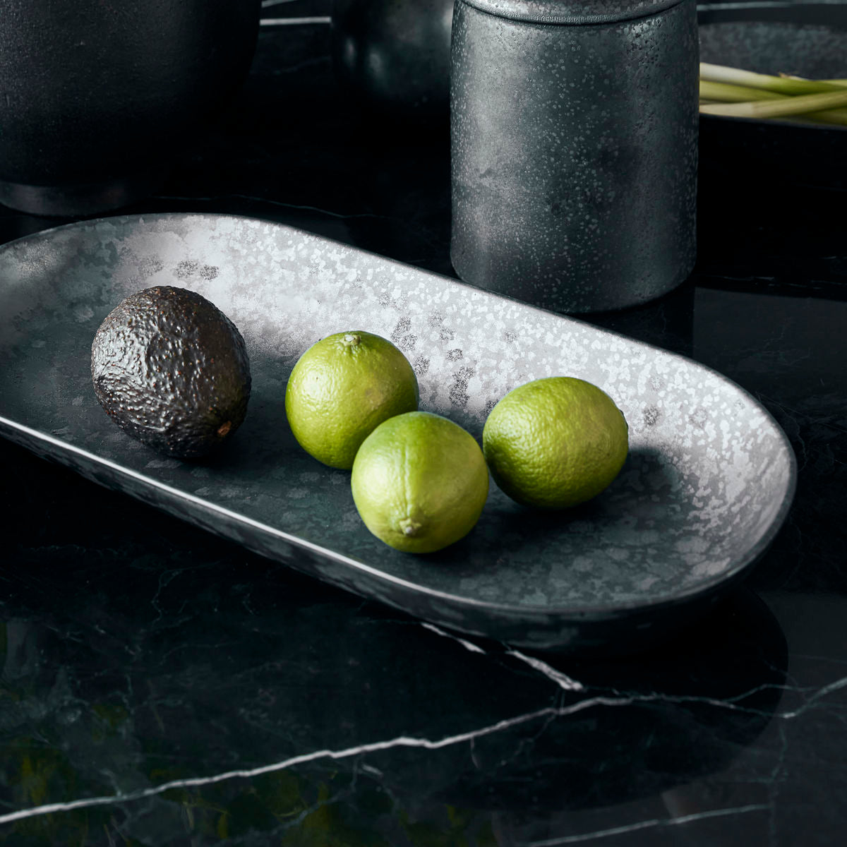 素朴でカジュアルなデザインは、石器の素材と黒の反応性釉薬が生みだす独特な表面によってつくられています。大きな黒いサービングディッシュで、料理を際立たせましょう。サラダから軽食まで、どんな料理も美味しそうに見せてくれます。同シリーズのアイテムや暗い色のディナーセットと組み合わせて、親和性の高いテーブルセッティングをお楽しみください。小さめのサイズやホワイト色もご用意しております。※釉薬のつや消しの質感により、使用時間の経過とともに傷が発生する場合がありますが、デザイン性と頑丈な魅力を増してくれるものです。