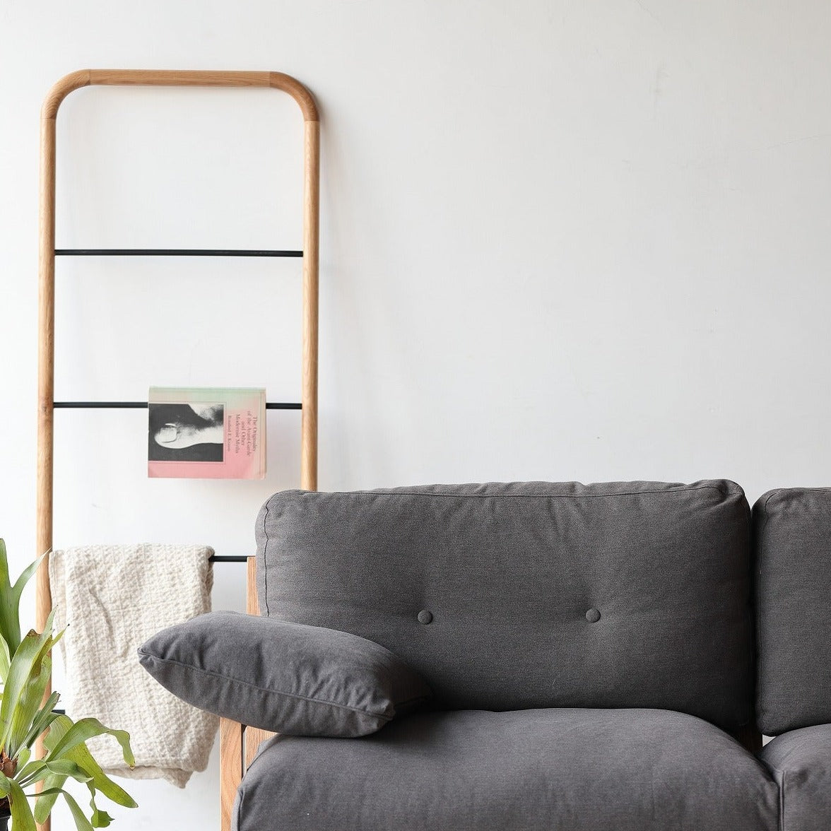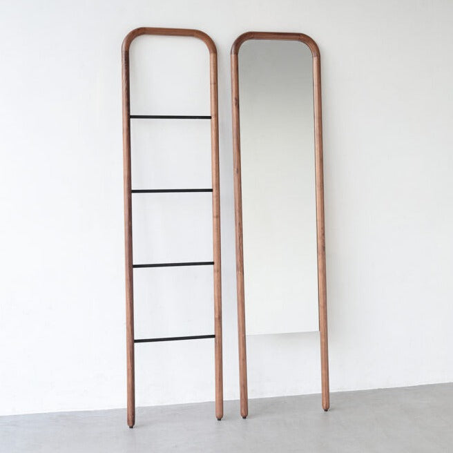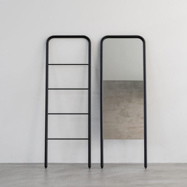 1本の丸棒を曲げてでできたようなミニマムなデザインのミラーとハシゴ状のハンガーです。クリーンでニュートラルな佇まいはインテリアにすっきりと馴染みます。リビングや玄関で活躍します。