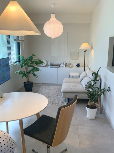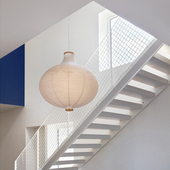 和紙と淡いバーチ材突き板のディテールが、ナチュラルでスタイリッシュなランプです。明かりをつけると、2重になった和紙が奥行きのあるすてきな模様を映し出し、柔らかく均一な光が広がります。