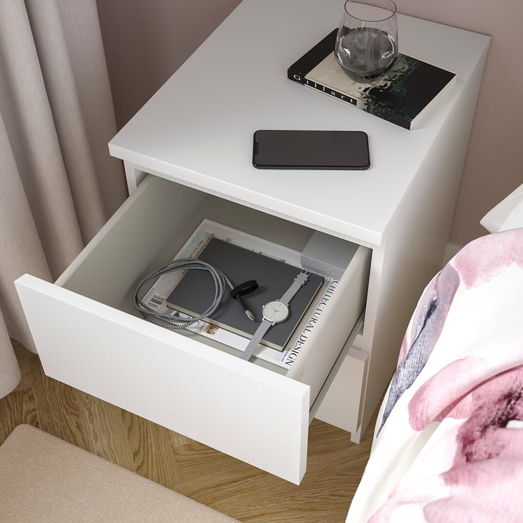ベッドルームにも家のどこにも、すっとなじむクリーンなデザインのサイドチェストです。動きのスムーズな引き出しが付いていて、仕上げが選べます。